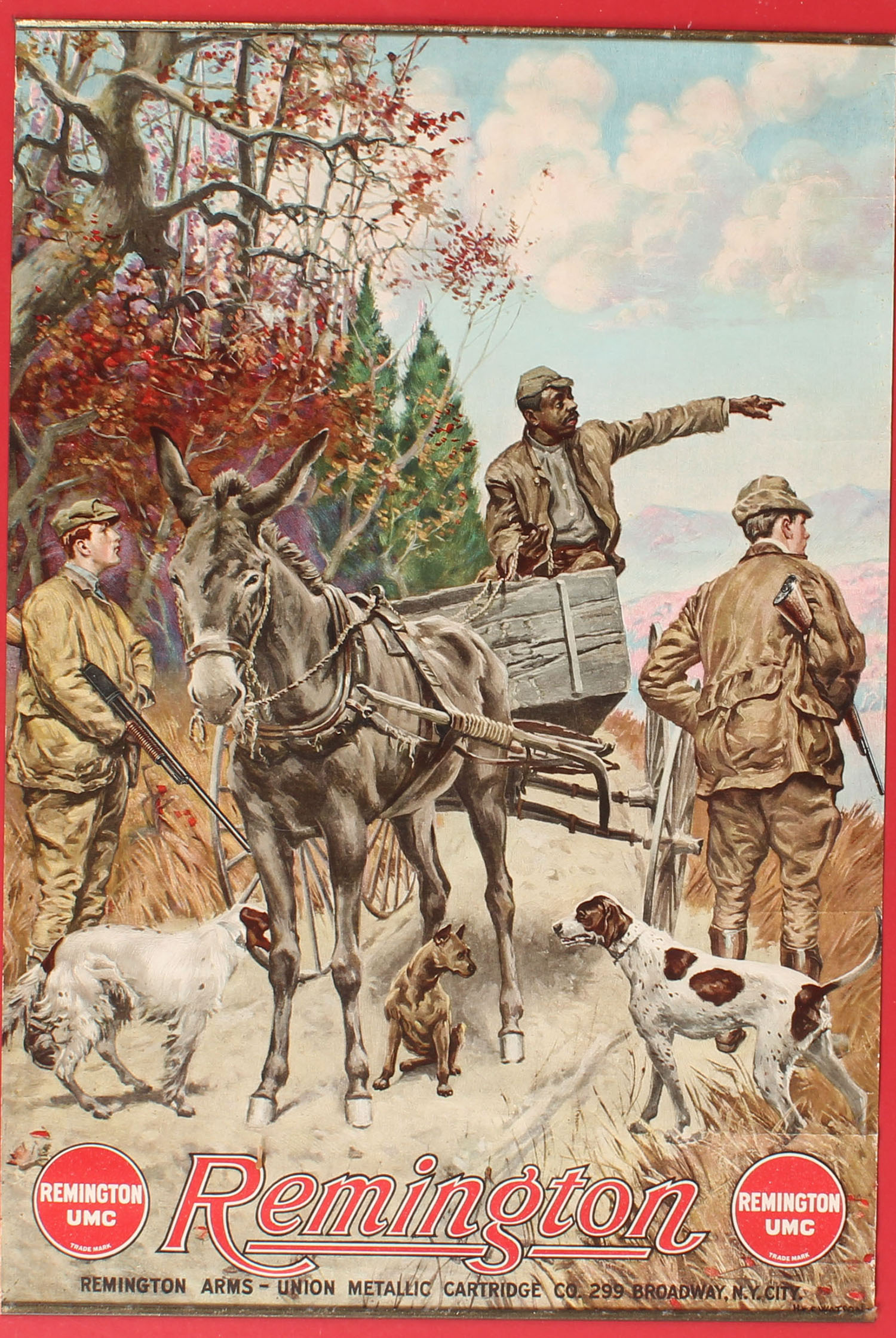 Remington Poster by Henry S. Watson, pictures two upland bird hunters asking directions from man in a wagon, they both are holding pump shotguns, circa 1913, 14 1/4'' x 21'', has metal bands with paper with hanger, wonderful colors with almost no wear. Grade: Excellent - Value: 500 to 2000