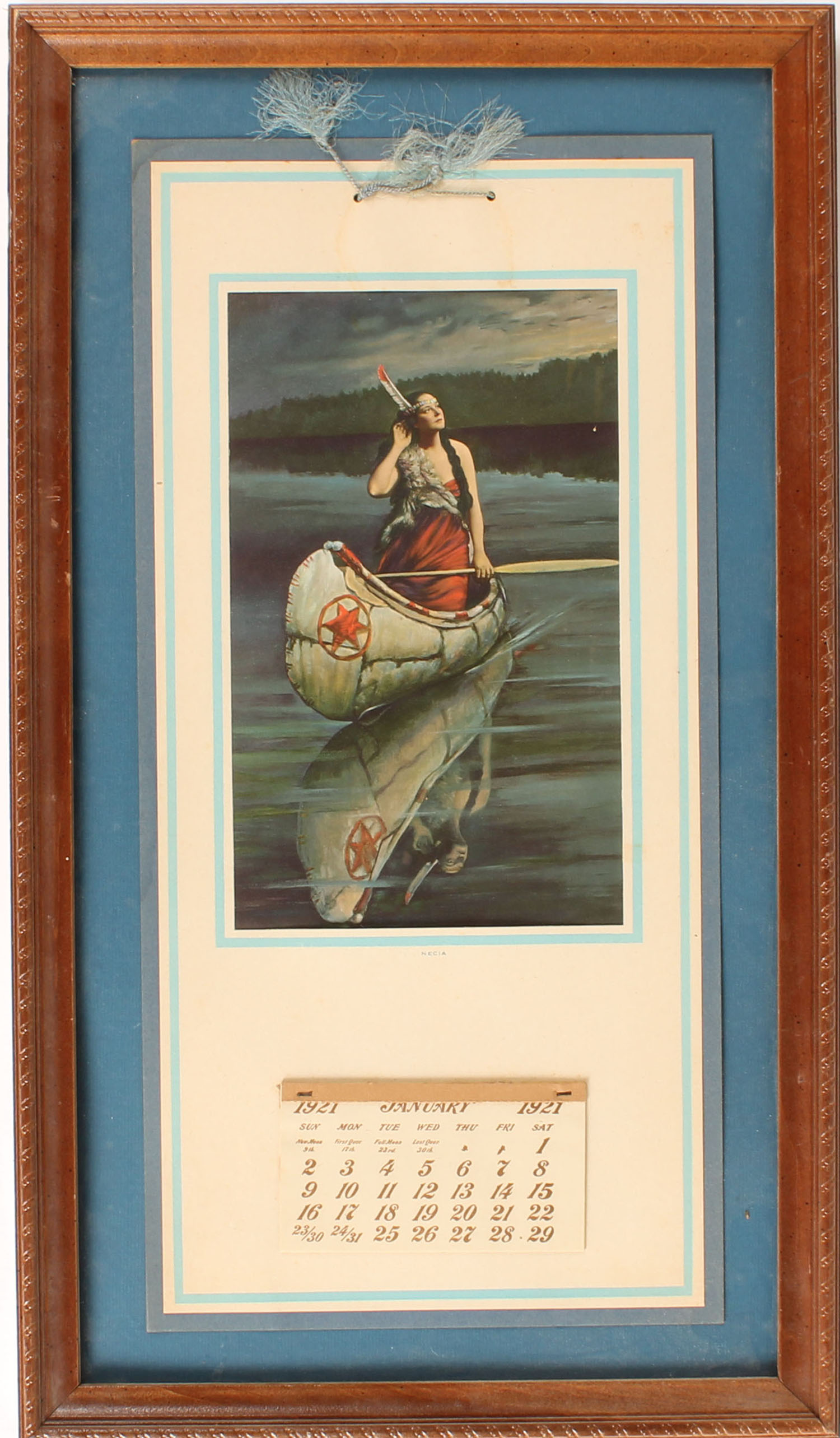 1921 Calendar pictures Indian lady in canoe, framed. Grade: MINT - Value: 10 to 50
