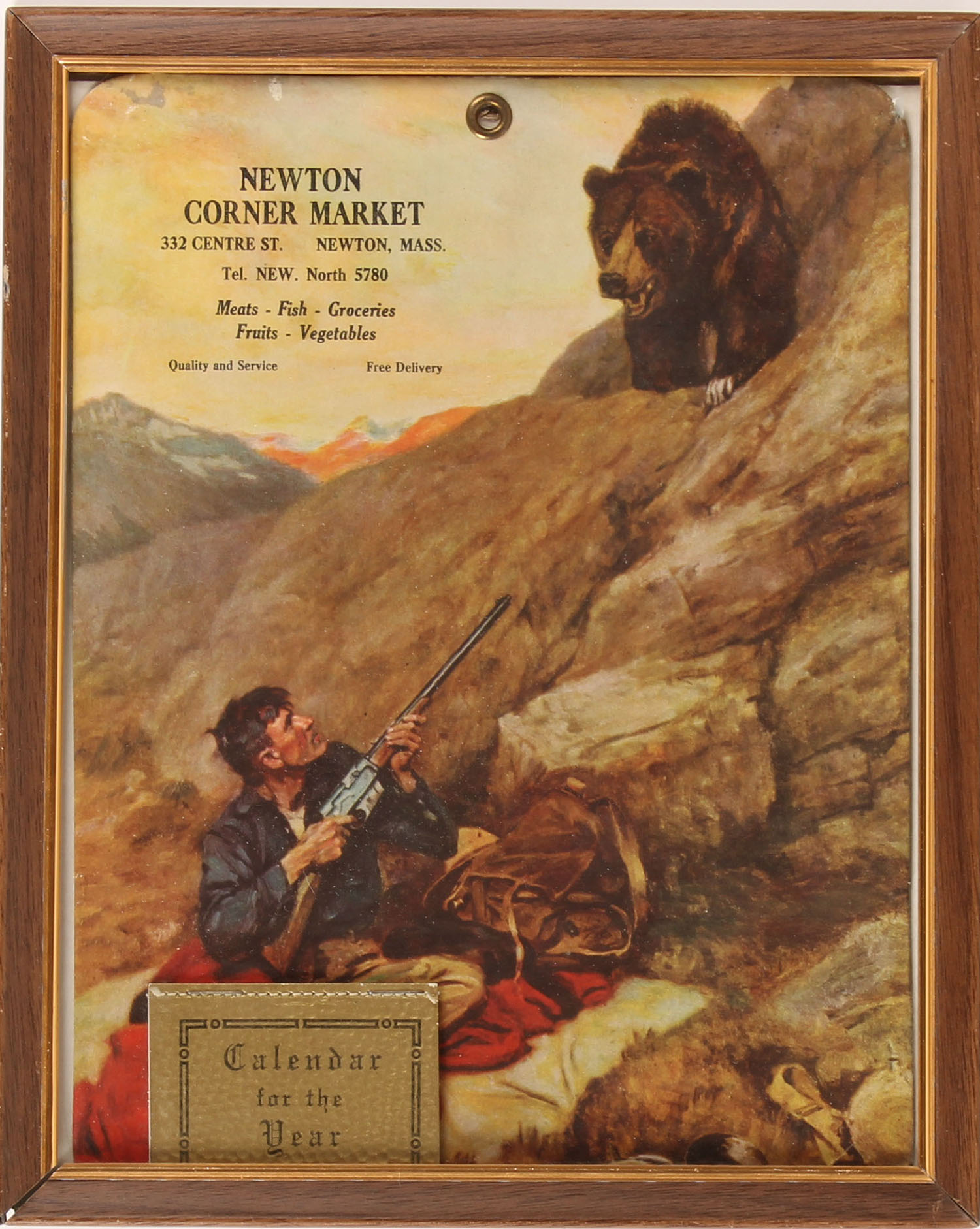 1920's Calendar pictures hunter below cliff with bear on the attack, framed. Grade: Excellent - Value: 10 to 60