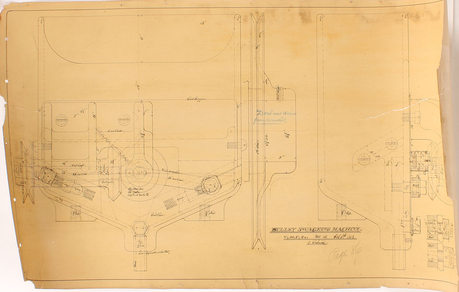 UMC BULLET SWAGING MACHINE blue print, dated Feb, 6th 1878, 33'' x 18 1/2'', has a few tears with tape repairs to back. Grade: Very Good - Value: 10 to 50