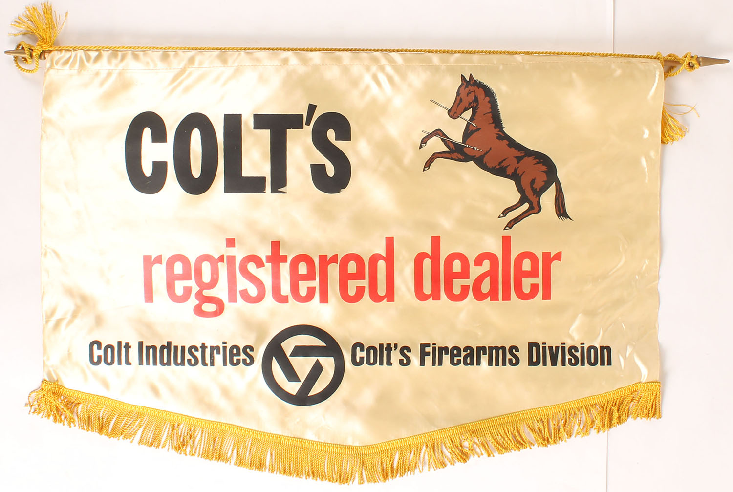 Colt banner, ''REGISTERED DEALER'', red, white, brown & black, all complete, 30'' x 21''. Grade: Excellent - Value: 40 to 150