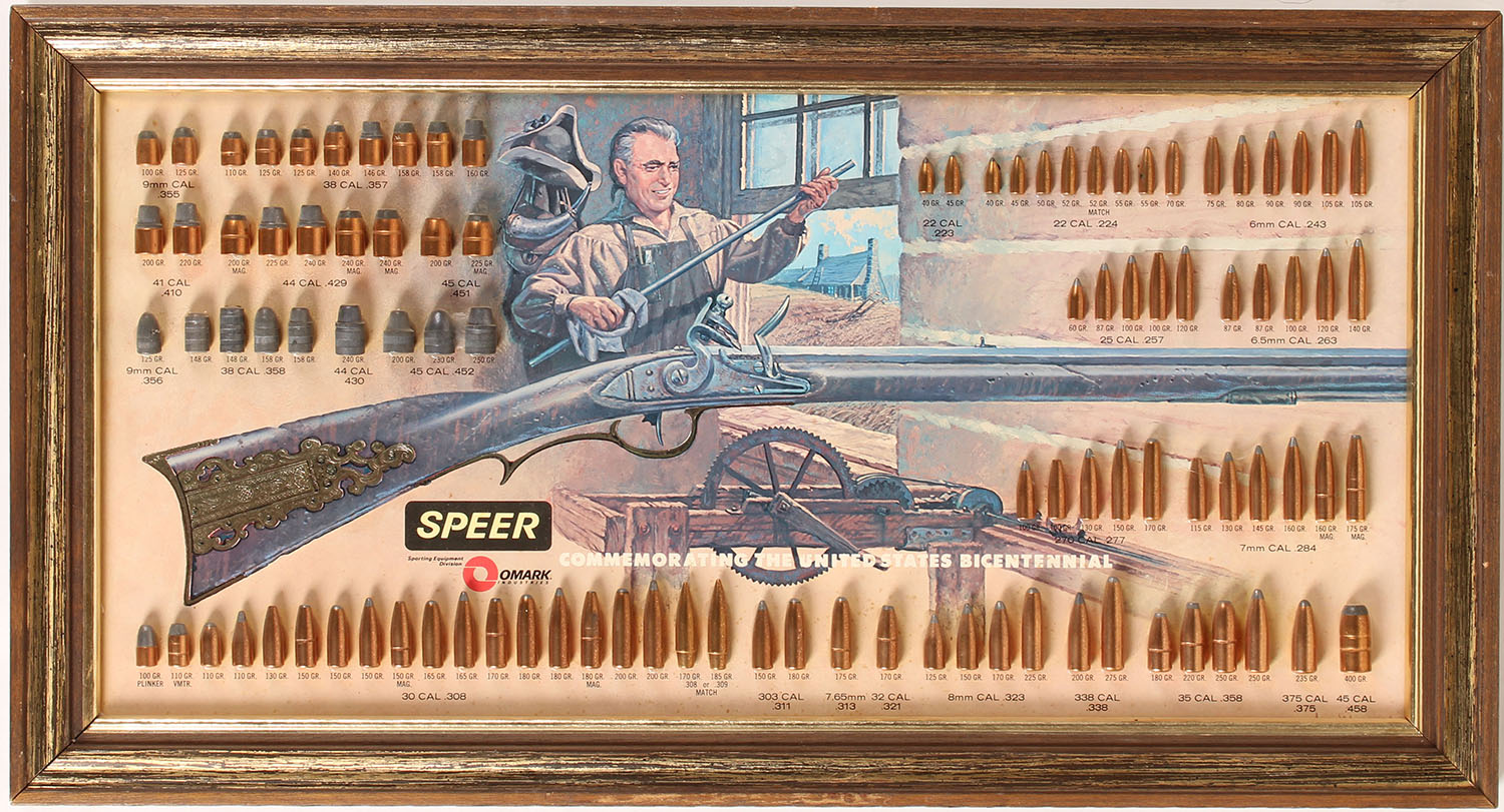 Speer Bullet Board, pictures Pennsylvania Kentucky Rifle being cleaned by frontiersman, all bullets intact. Grade: Excellent + - Value: 100 to 300