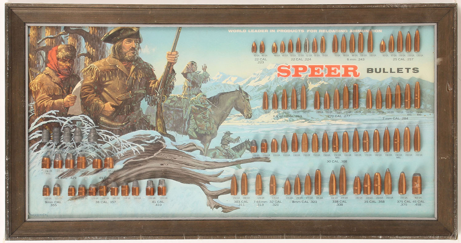 Speer Bullet Board, pictures Lewis & Clark in a snow scene, all bullets intact. Grade: Excellent + - Value: 100 to 300