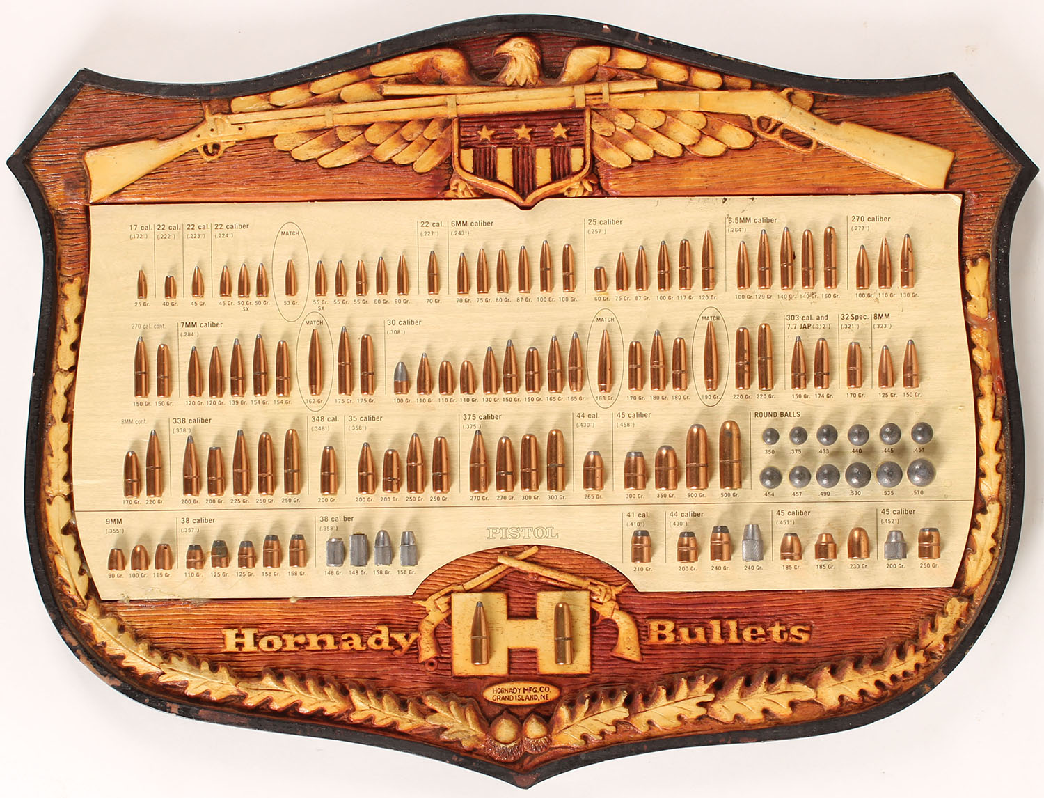 Hornady Bullet Board, all bullets intact, 21''. Grade: Excellent + - Value: 100 to 300