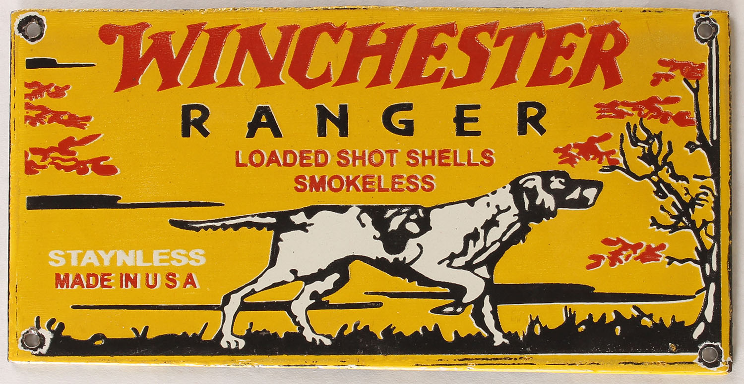 Winchester modern porcelain metal sign, advertising Ranger with dog on point, 8'' x 4'' dia., Grade: Excellent - Value: 70 to 200