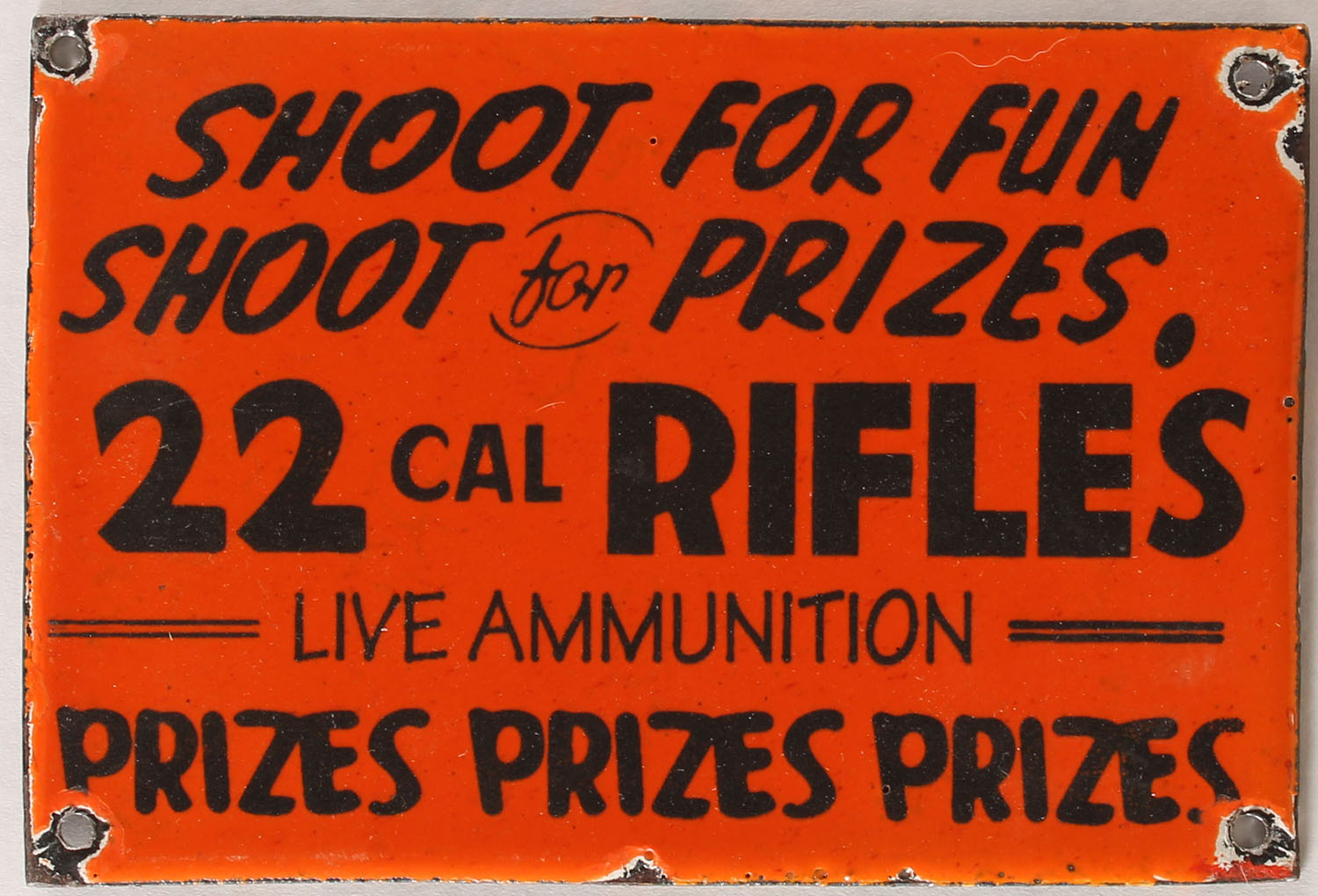 Modern porcelain metal sign, advertising Shoot for Fun, Shoot for Prizes .22 Cal Rifles, Live Ammunition, PRIZES, PRIZES, PRIZES, 6'' x 4'' dia., Grade: Excellent - Value: 70 to 200