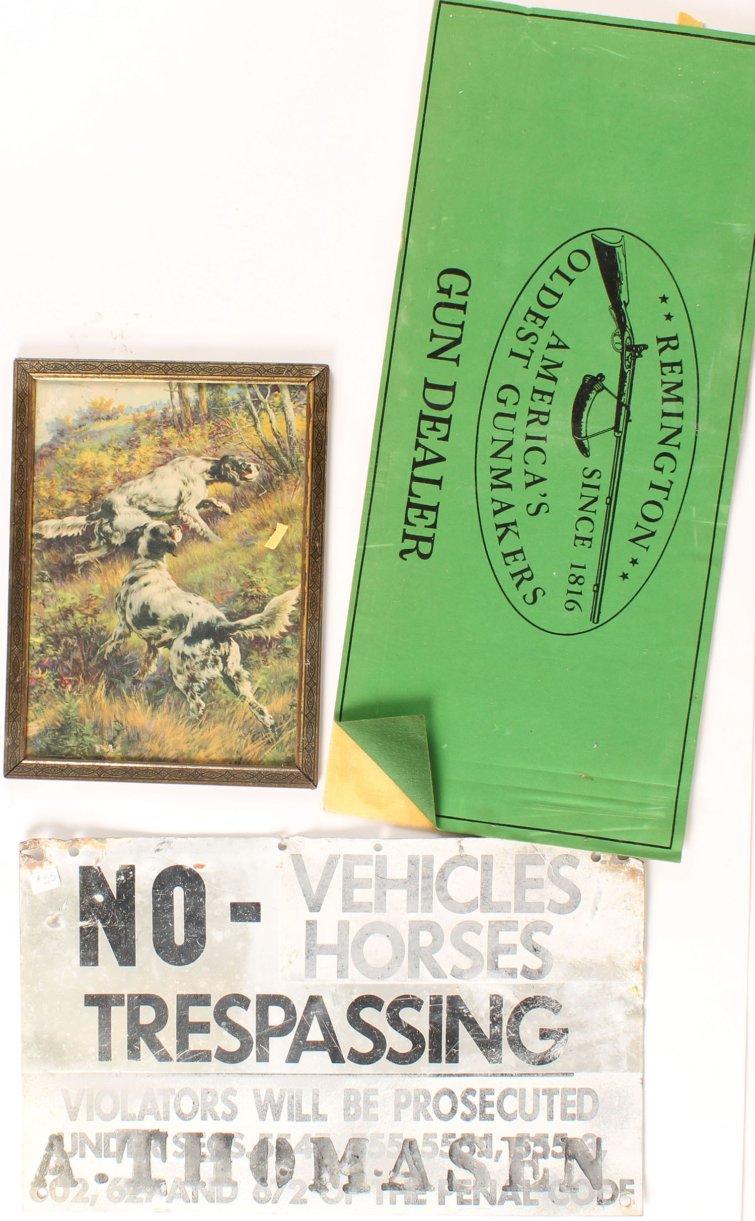 Lot of 3 items, No Trespassing metal sign, counter mat & a print by Edmond Osthaus. Grade: Very Good + - Value: 10 to 100
