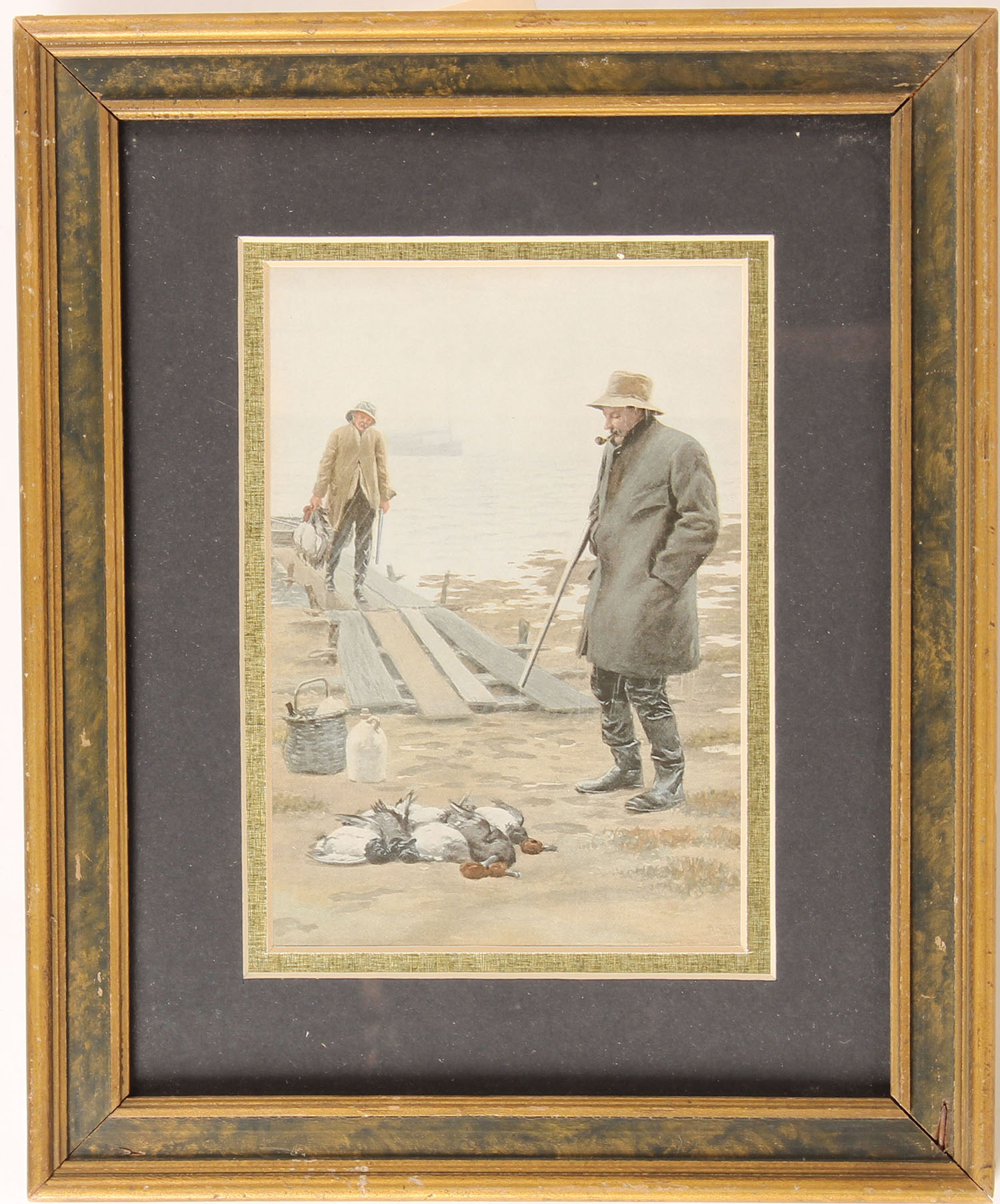 ''Coming Ashore'' 1903 sporting watercolor by American artist Arthur Burdett Frost (1851-1928). Frost was born in Philadelphia and is considered one of Americas best sporting artists and illustrators. This print marked ''Copyright 1903 Charles Scribners Sons NY'' (publisher), titled Good Luck, image size 4 1/2'' X 6 1/2'', framed. Grade: Excellent - Value: 30 to 250