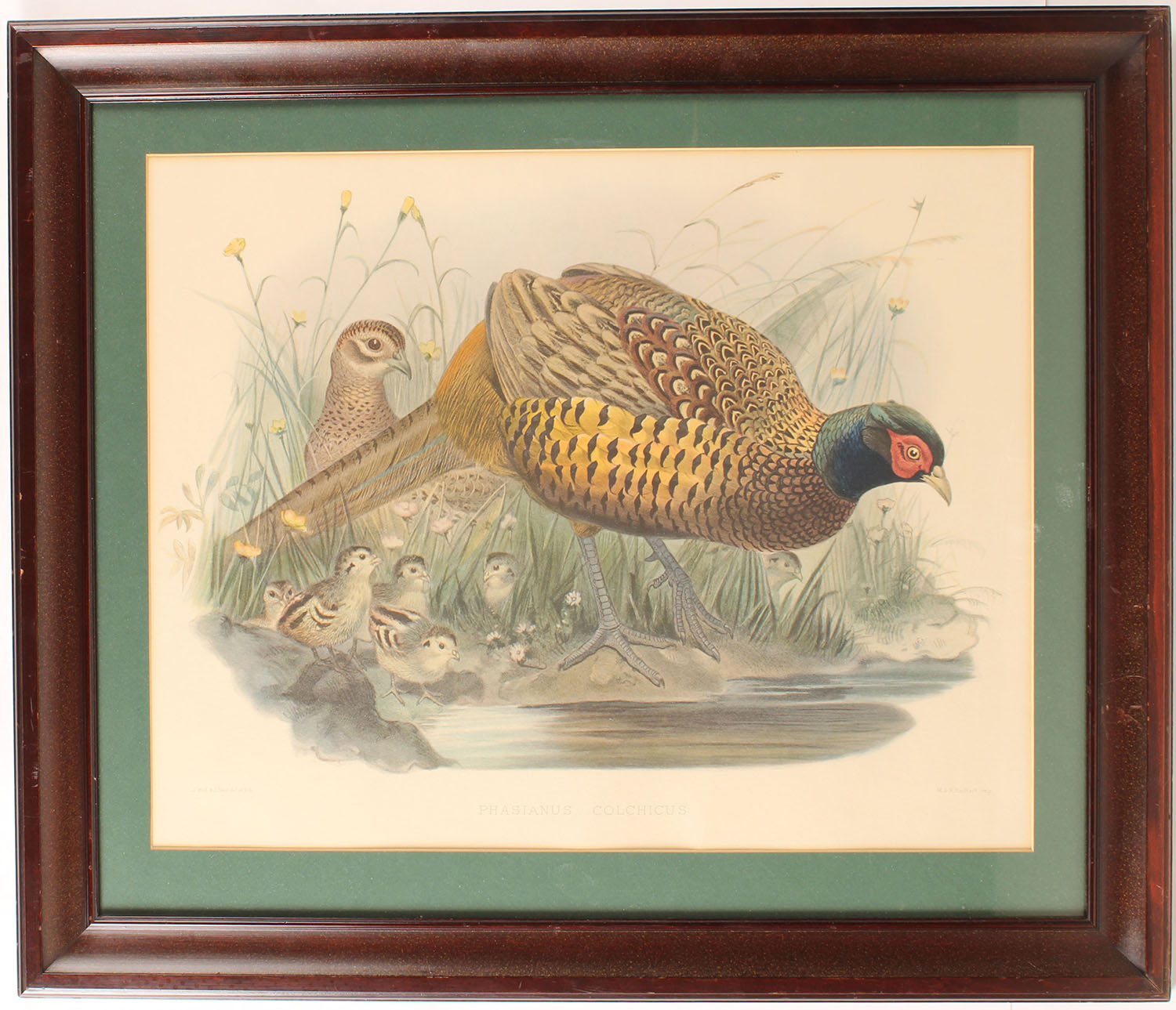 PHASIANUS COLCHICUS print by J. Wolf & J Smit del et lith, pictures a wonderful full color image of a rooster pheasant and his family, marked M. & H. Hanhart imp.. Image size 21'' x 17'', framed. Grade: Excellent - Value: 10 to 250