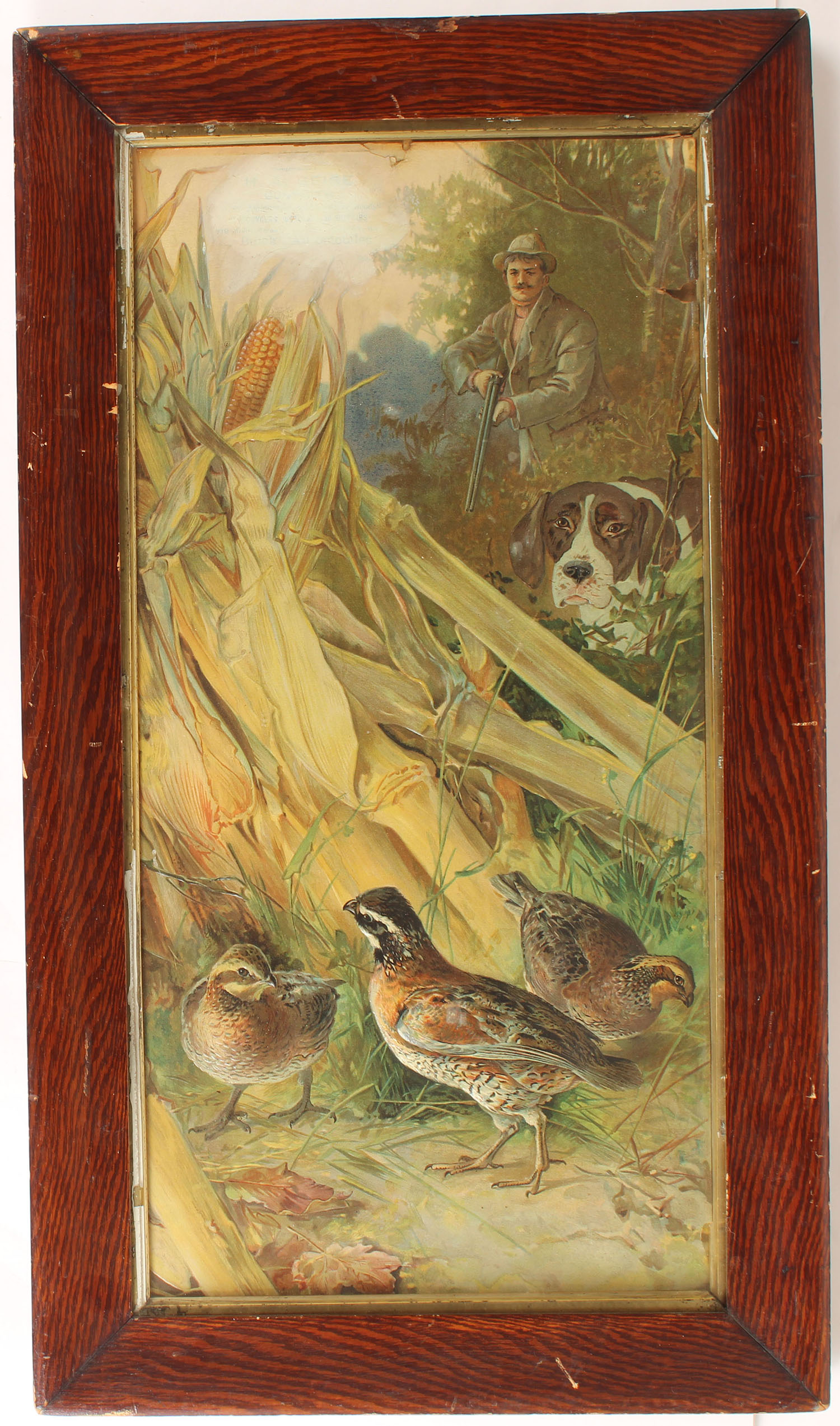 3D print pictures a full color image of hunter holding adouble shotgun with his dog looking at a covey of Bobwhite Quail, circa 1906, image size 11'' x 23'', framed. Grade: Very Good ++ - Value: 10 to 100