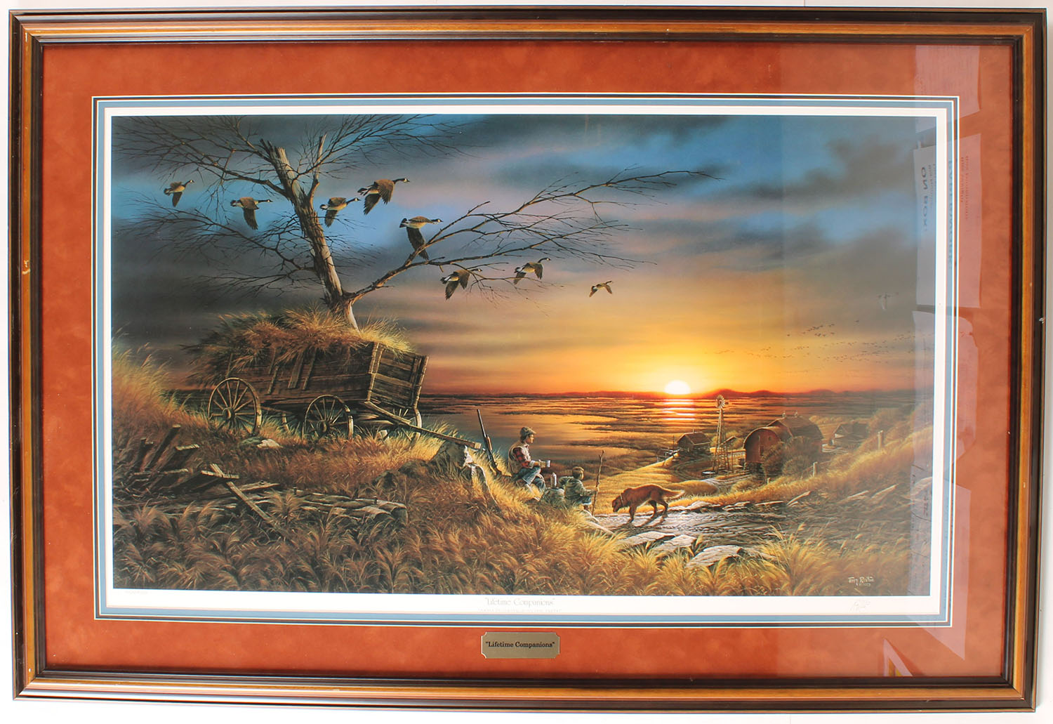 1993 Terry Redlin print ''LIFETIME COMPANIONS'', pictures father & son with dog looking at the geese fly over at sunset, Terry is a very well known wildlife artist & does a lot of work for DU, image size 32'' x 18 1/2'', 60/29500, framed & matted. Grade: MINT - Value: 50 to 500
