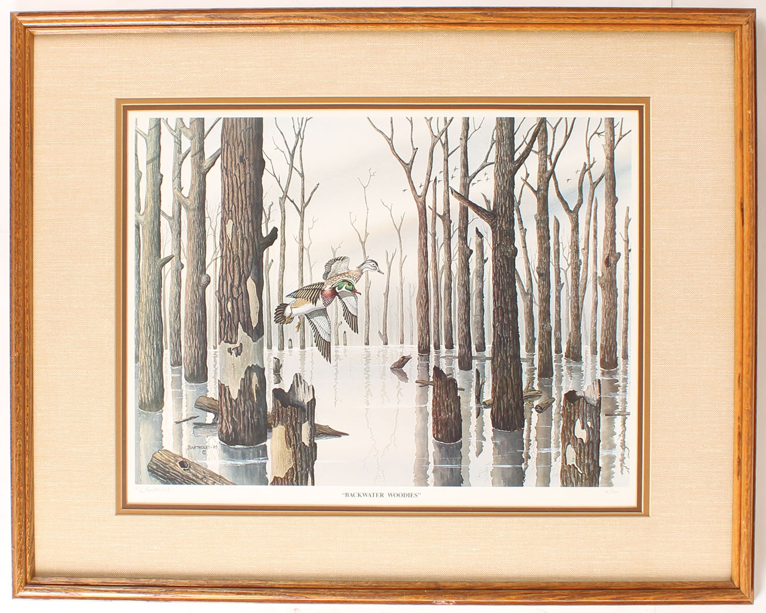 1985 Bartholet print ''BACKWATER WOODIES'', pictures a pair of Woodducks flying into flooded timber, 6/500, image size 20'' x 14 1/2'', framed & matted. Grade: MINT - Value: 10 to 200
