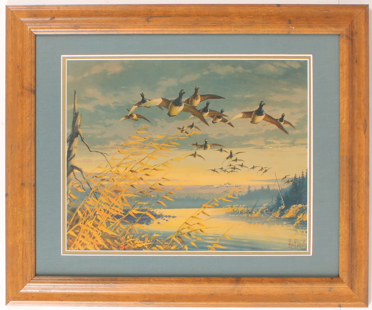 Les Kouba print pictures bluebill in flight right at you, image size 16'' x 12'', framed & matted. Grade: Excellent - Value: 10 to 60