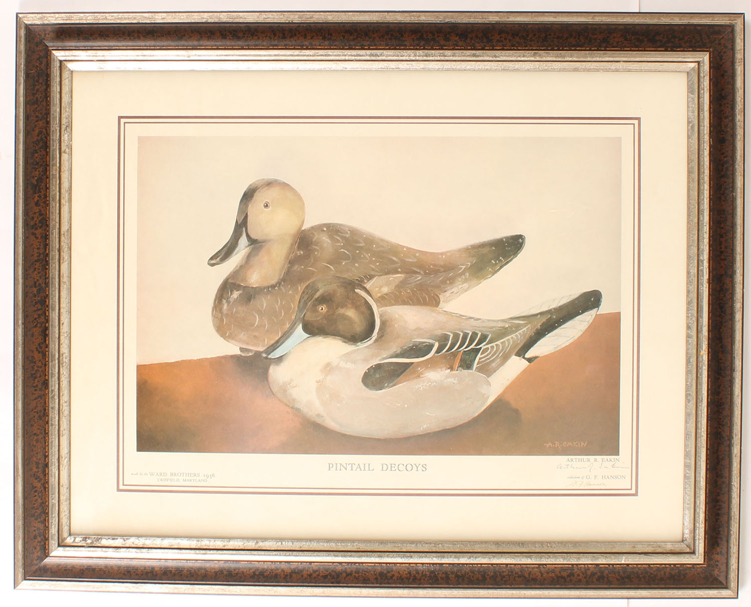 Arthur R Eakin print, ''PINTAIL DECOYS'', pictures Ward Brosther 1936 decoys, very nice colors, image size 20'' x 13'', framed & matted. Grade: MINT - Value: 2 to 200