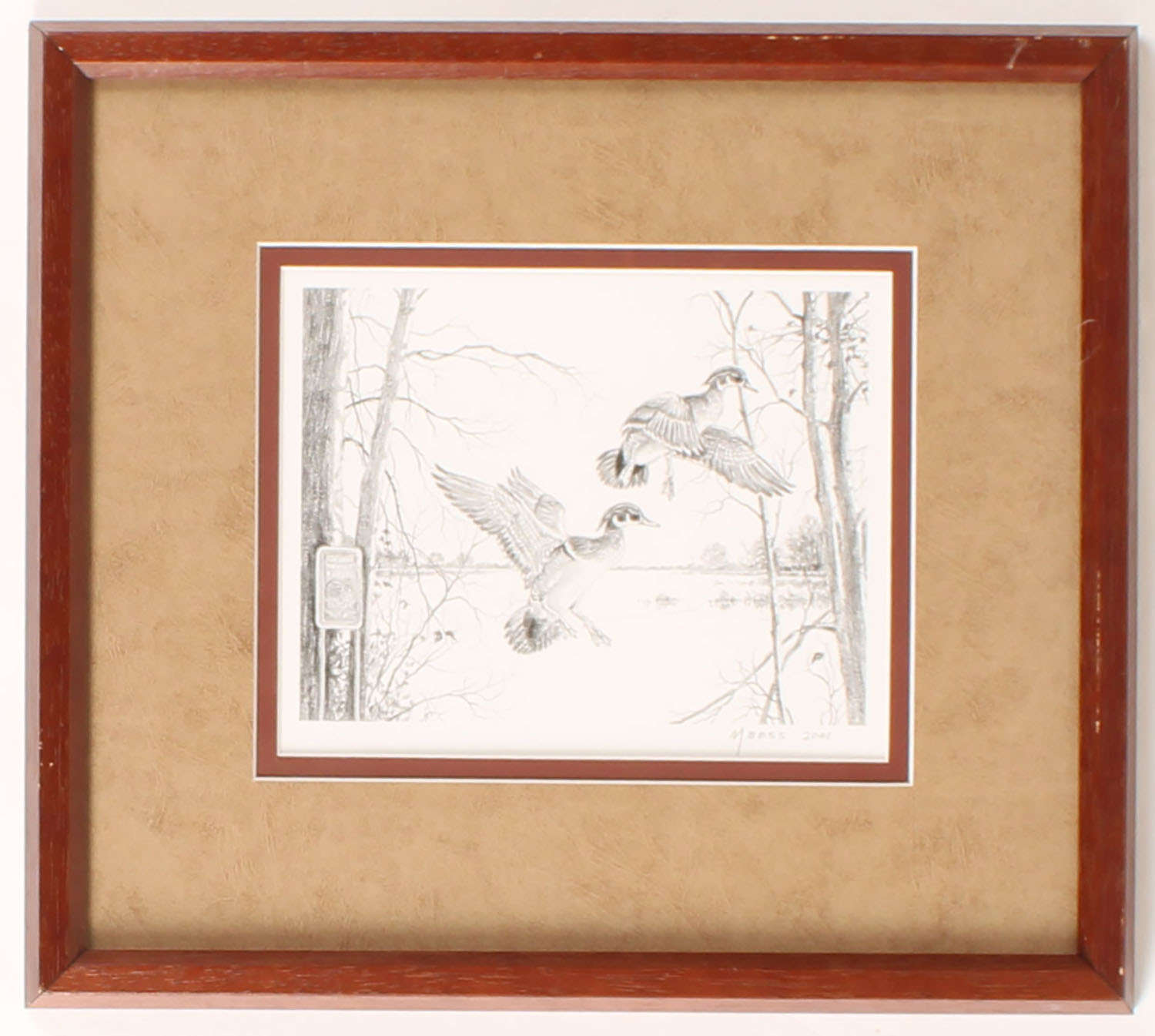 2001 David A. Maass print, pictures Woodducks in flight, image size 7 1/2'' x 6'', framed & matted. Grade: MINT - Value: 10 to 100