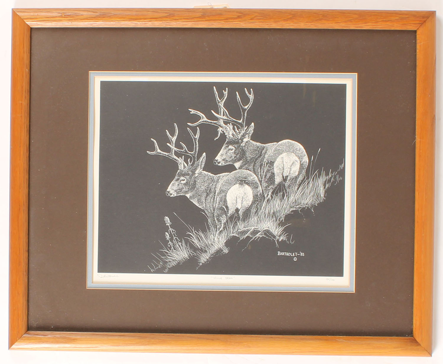 1985 Bartholet print, ''MULE DEER'', pictures mule deer on hill side, image size 12'' x 10'', framed & matted. Grade: Excellent - Value: 10 to 50