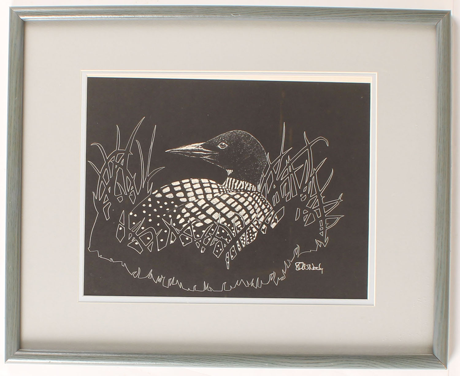 Wheely print, pictures loon in grass, image size 13'' x 10'', framed & matted. Grade: Excellent - Value: 10 to 50