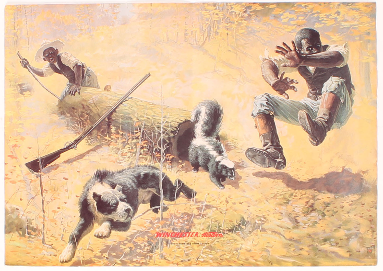 Winchester-Western Print, ''SHOOT THEM AND AVOID TROUBLE'', this is the poster Winchester had to remove from shelves as it was too controversial, this is a remake of it in the 1980's, 17'' x 12''. Grade: Excellent - Value: 20 to 200