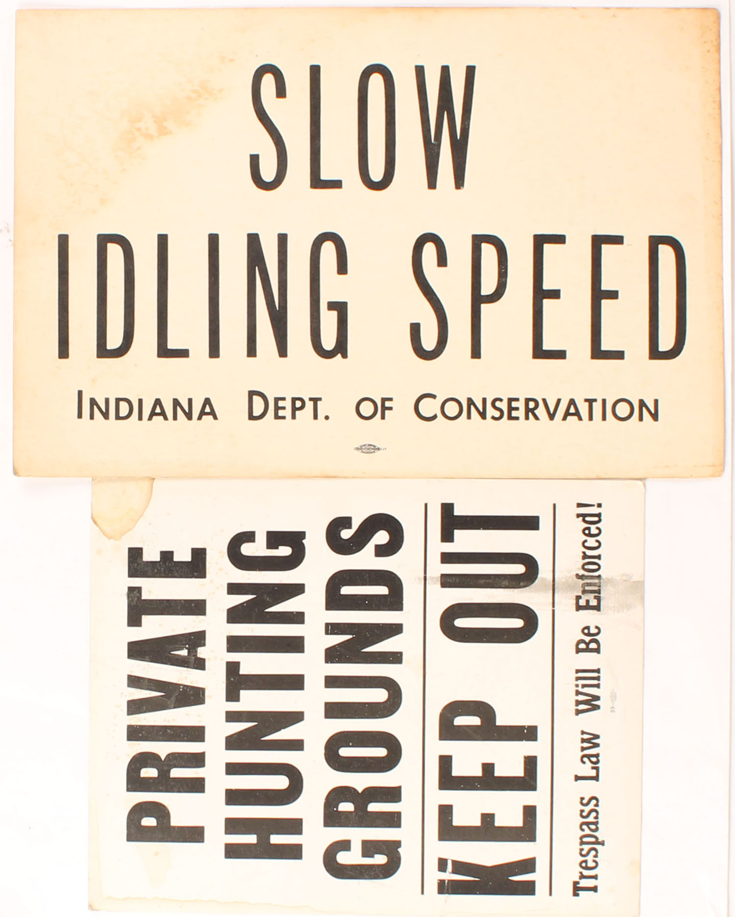Lot of 2 paper signs, Private Hunting & Slow Down. Grade: Very Good - Value: 2 to 30