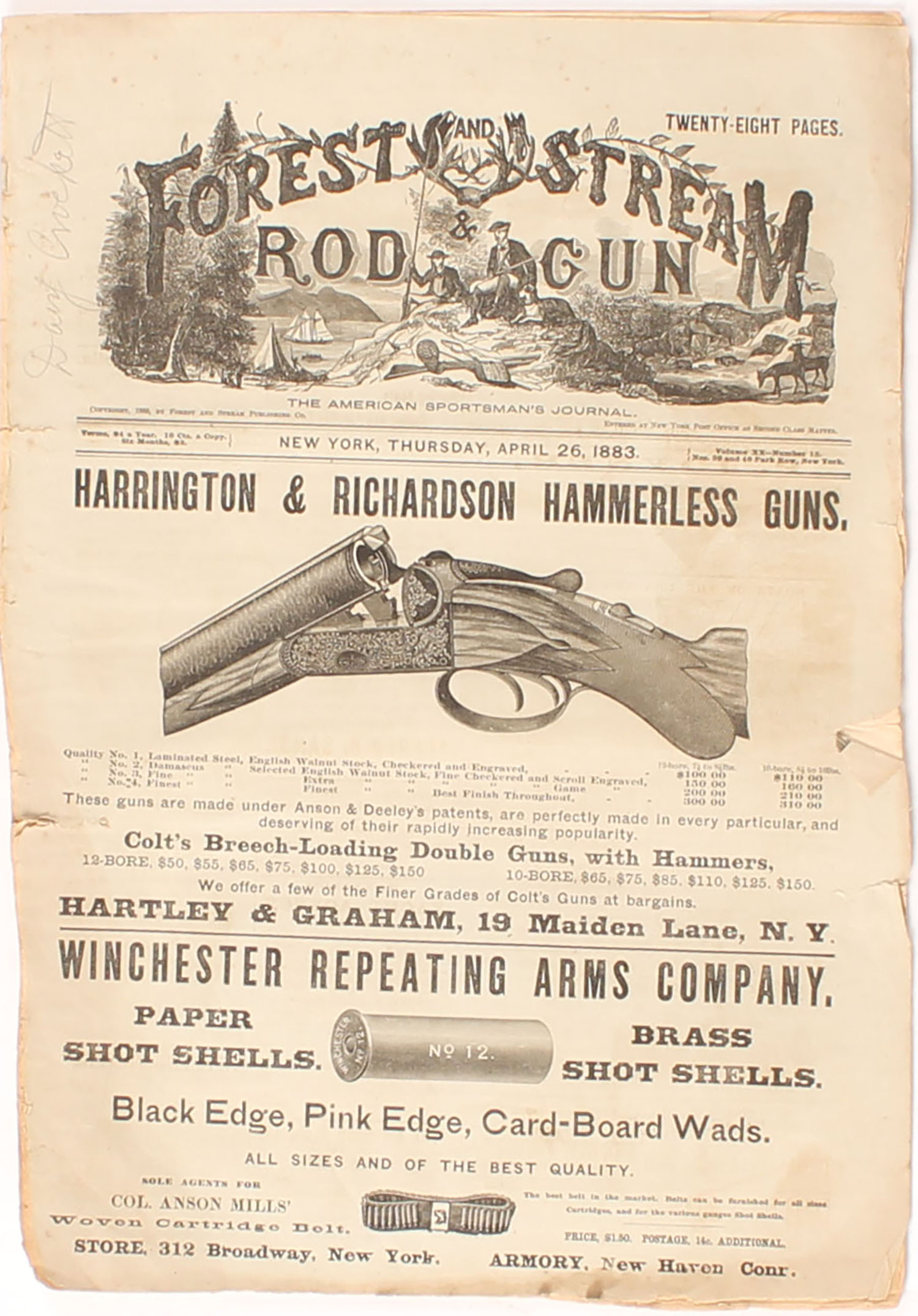1883 Forest & Stream magazine, has many ads for guns & sporting goods, 11'' x16''. Grade: Very Good - Value: 2 to 30