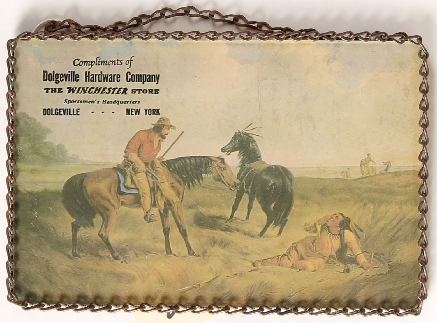 Winchester Chain Art, pictures guy on horseback shooting at Indians, 7'' x 5'', not produced by Winchester. Grade: Excellent - Value: 50 to 150