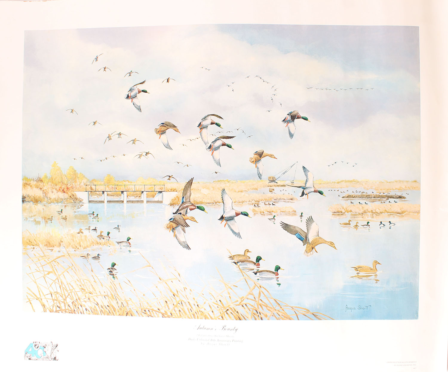 Angus Shortt print ''AUTUMN'S BOUNTY'', pictures lots of mallards flying around a bay, reproduced by DU, image size 26'' x 18''. Grade: Excellent - Value: 2 to 30