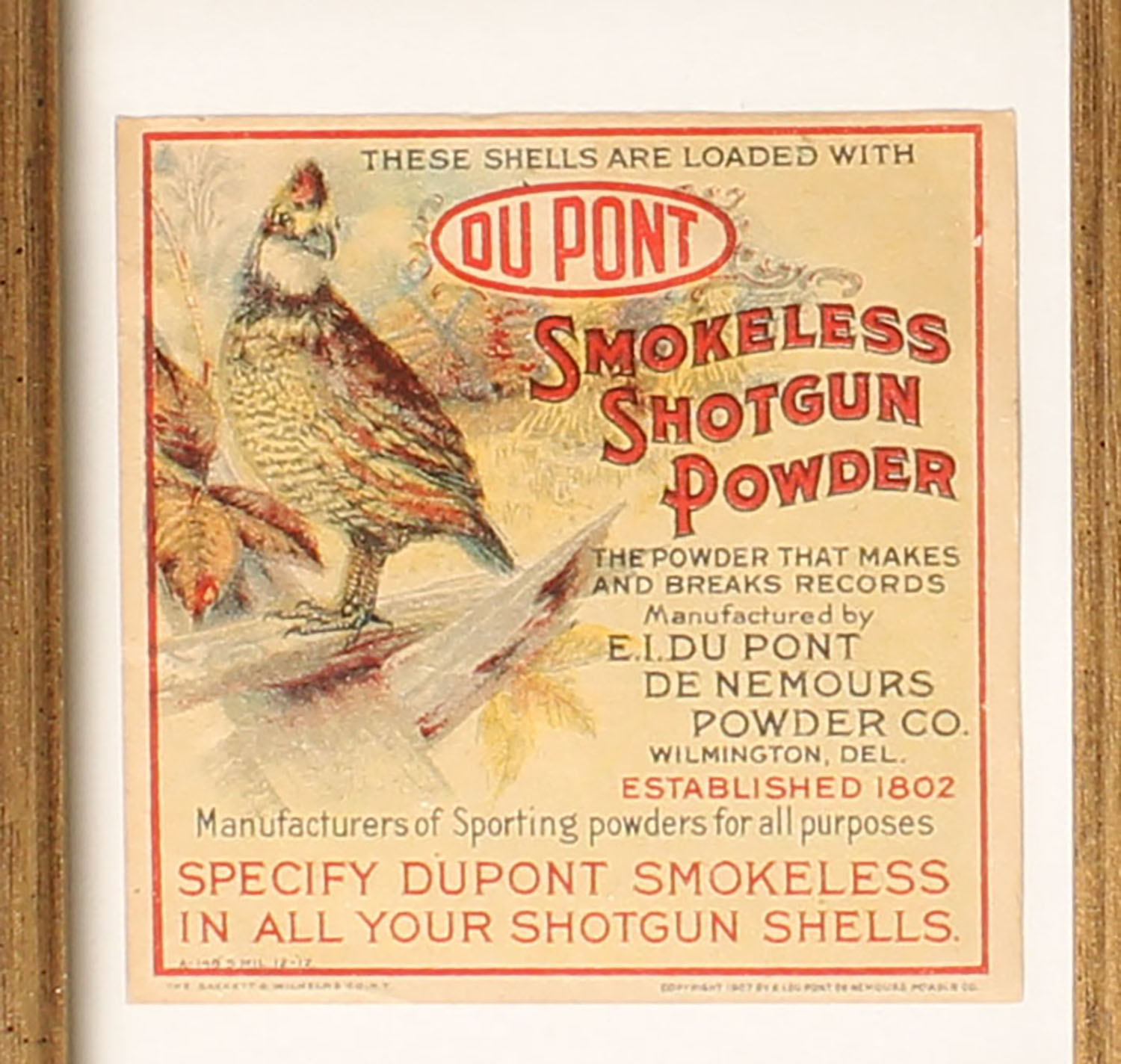 Dupont Powders Shotshell box insert, pictures quail on log with Du Pont in oval, framed. Grade: Excellent + - Value: 30 to 100
