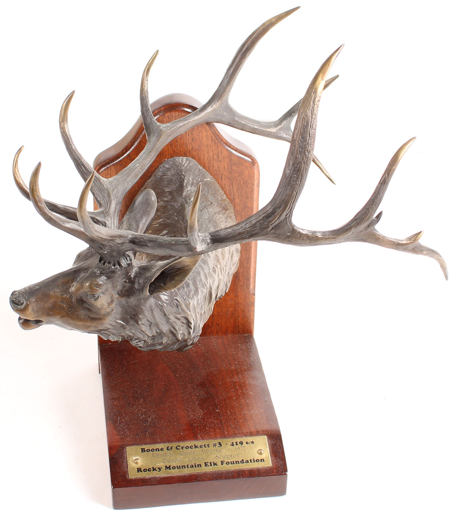 Boone & Crockett #3-419 6/8. Bronze Elk Head by Sculptor Dennis Jones. Rocky Mountain Elk Foundation. Panther River Alberta, 1977, Measure 14 inches tall to tip of antlers x 11 inches across x 10 inches deep. Grade: Excellent ++ - Value: 200 to 1000