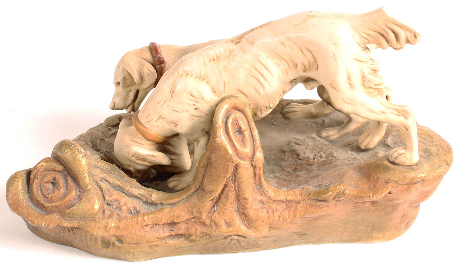 Ceramic Two English Seters on point, both tails have broken off, 10'' x 6'' tall. Grade: Very Good - Value: 10 to 100