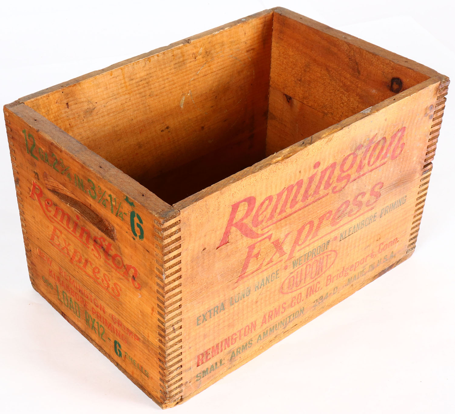 Remington Kleanbore Express, 12 Ga., nail construction, red, & green print and crate is solid, has age soiling. Grade: Excellent - Value: 30 to 90