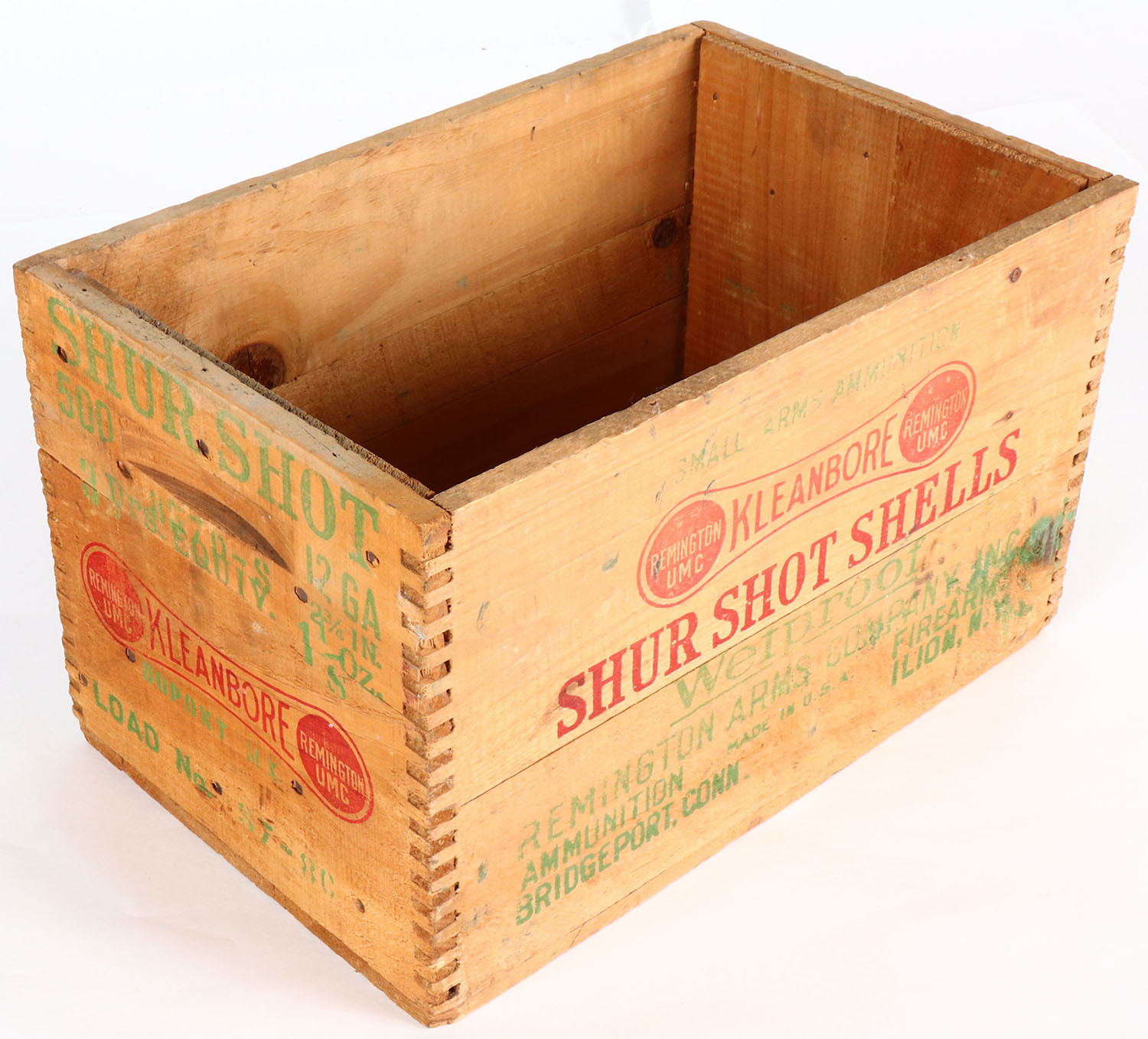 Remington Shur Shot, 12 Ga., tongue and groove construction, red, & green print and crate is solid. Grade: Excellent + - Value: 20 to 80