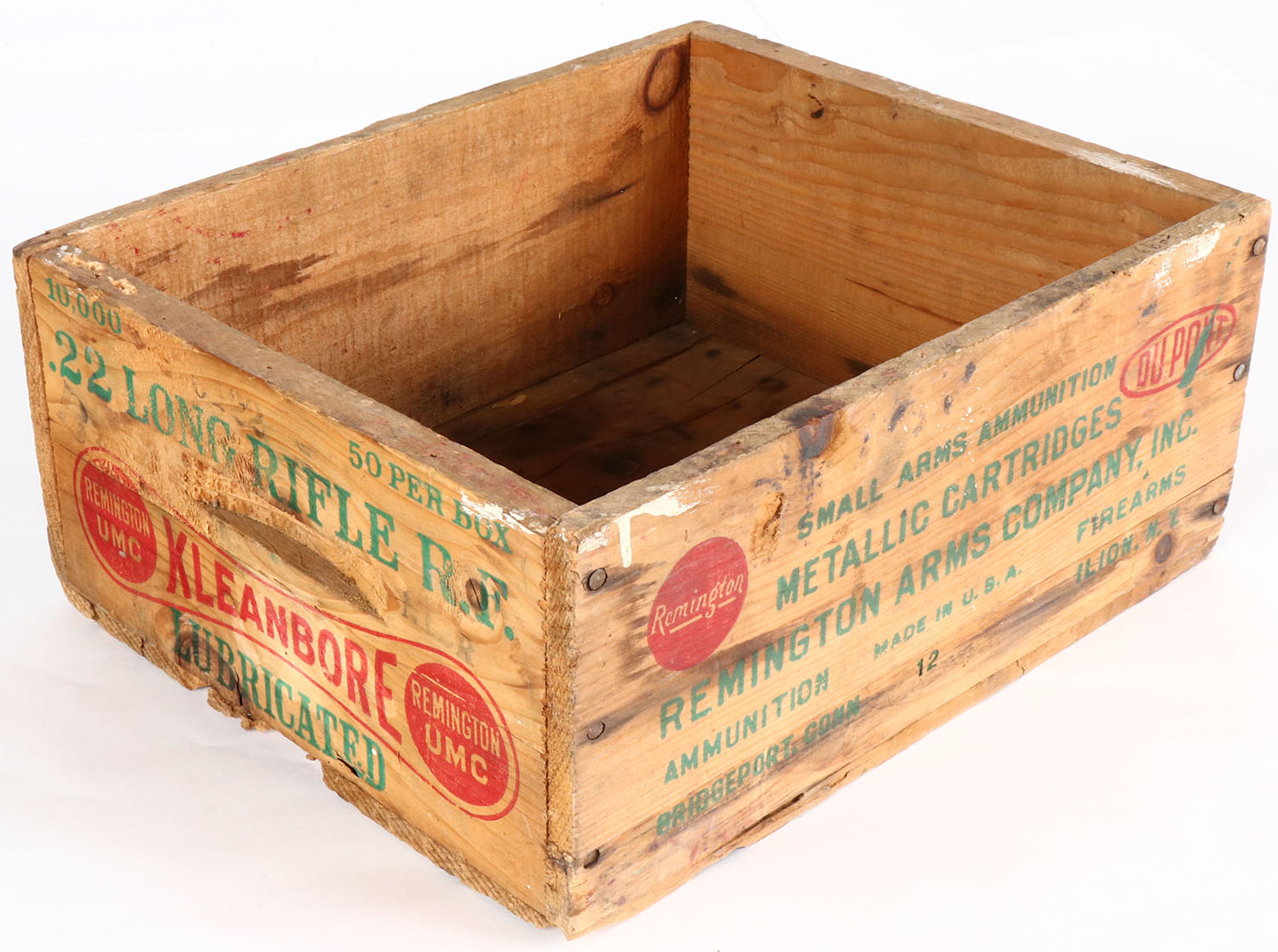 Remington Kleanbore Long Rifle, nail construction, red, & green print and crate is solid with some age soiling. Grade: Very Good ++ - Value: 10 to 50