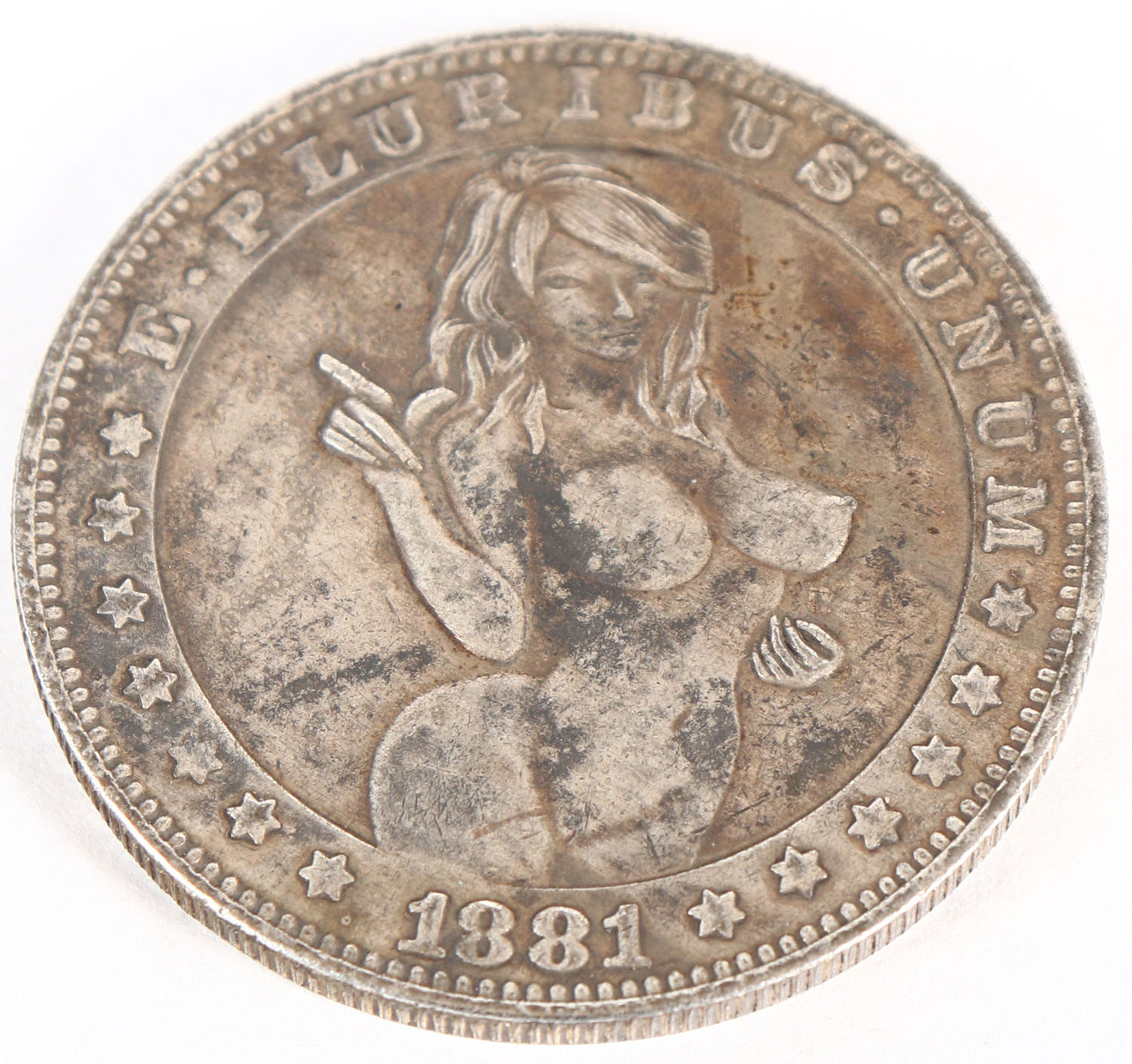 RARE! 1881 nude silver dollar coin with eagle on back. Grade: Excellent - Value: 100 to 400