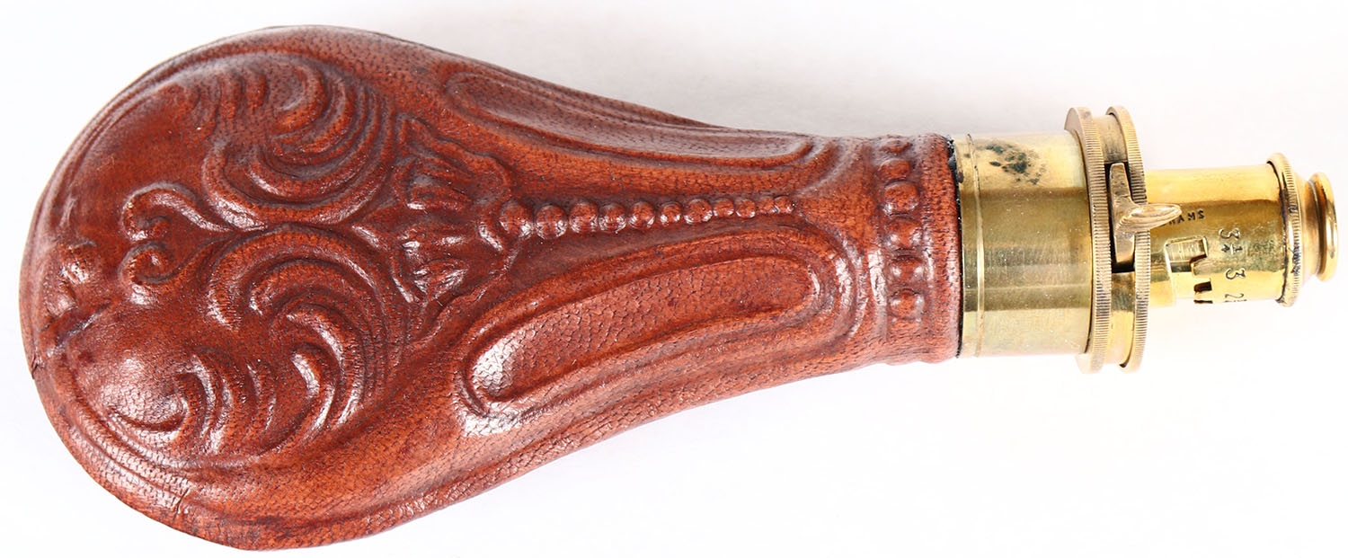 Leather Powder flask, G&J Hawksley with beautiful design. Grade: Very Good ++ - Value: 40 to 150