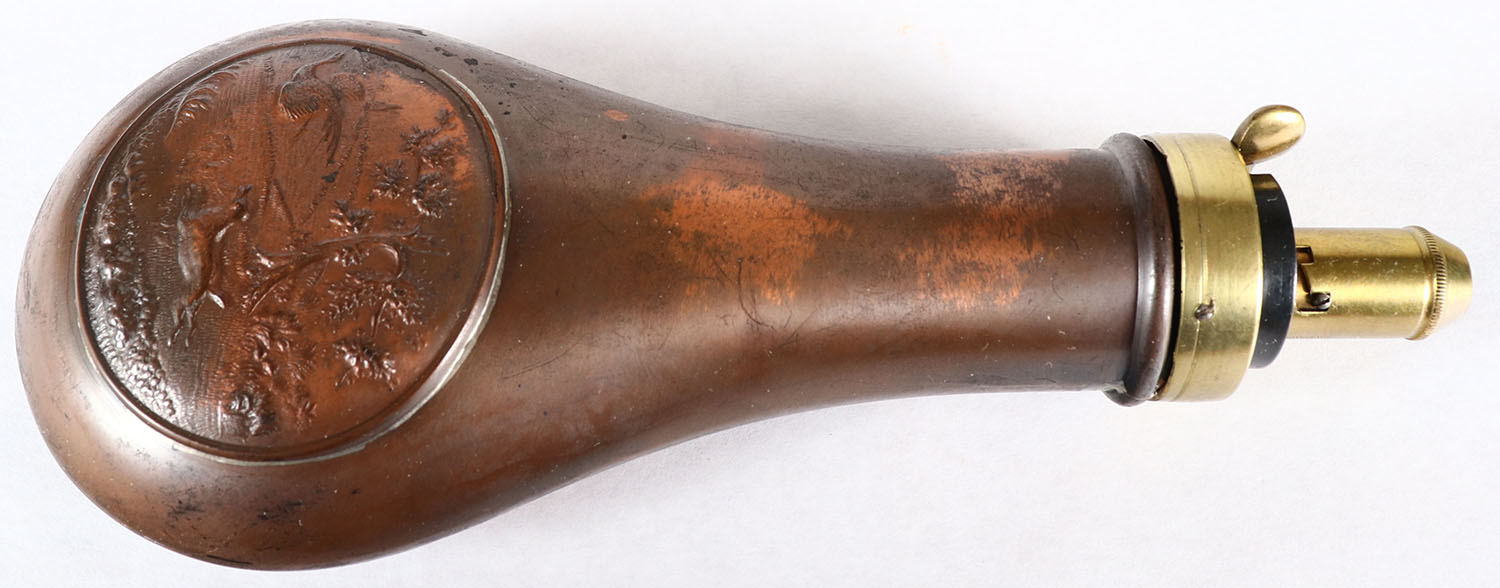 James Dixon & sons Sheffield Brass Powder flask, has age soiling Grade: Very Good - Value: 20 to 60
