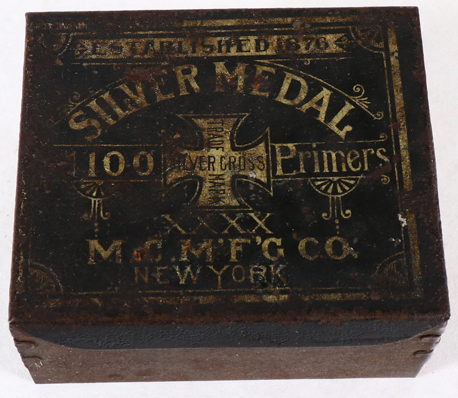 Silver medal Silver cross primer tin, 1870, empty, has scuffing. Grade: Very Good - Value: 20 to 50