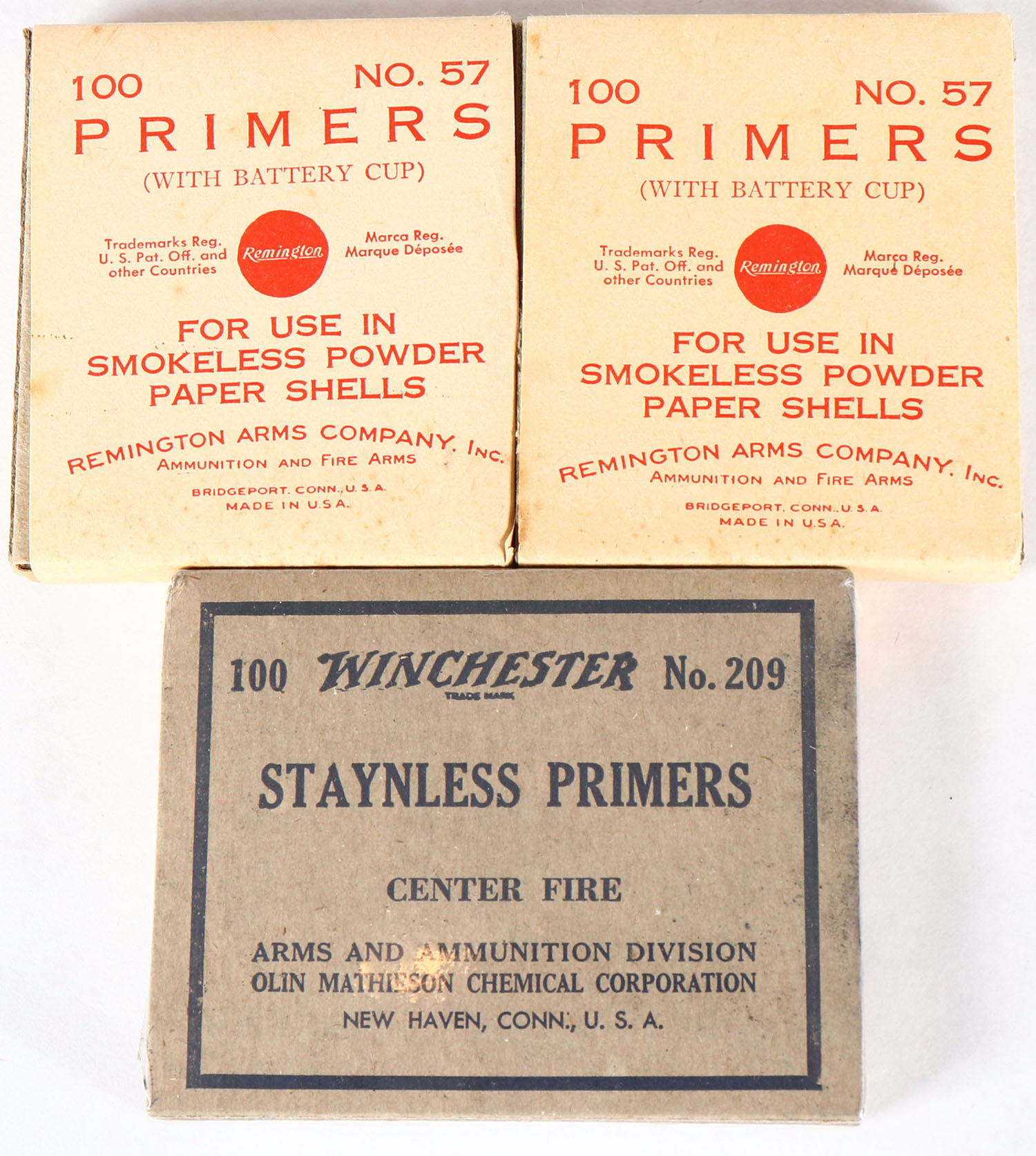 Lot of 3 Remington and Winchester primer box, all full. Grade: Excellent - Value: 2 to 20
