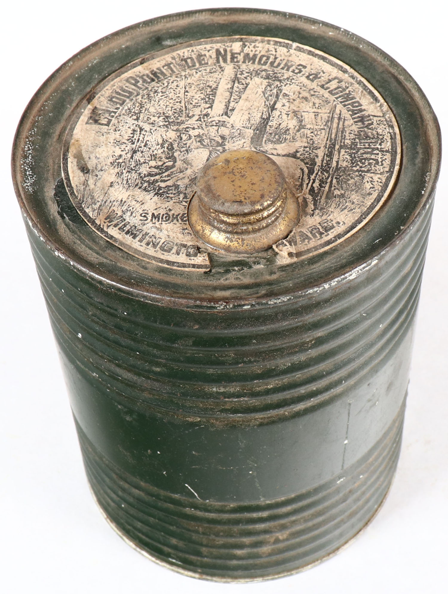 DuPont Smokeless powder tin, green tin has some wear, label and print have age soiling on both ends. Grade: Excellent - Value: 20 to 60