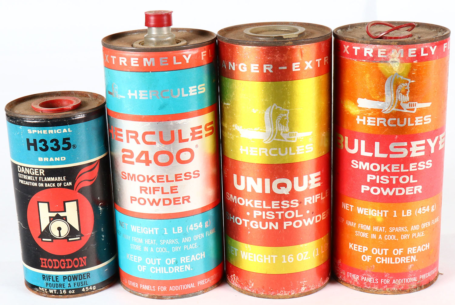 Lot of 4 Hercules powder cans, all partial, have rust. Grade: Very Good - Value: 10 to 50