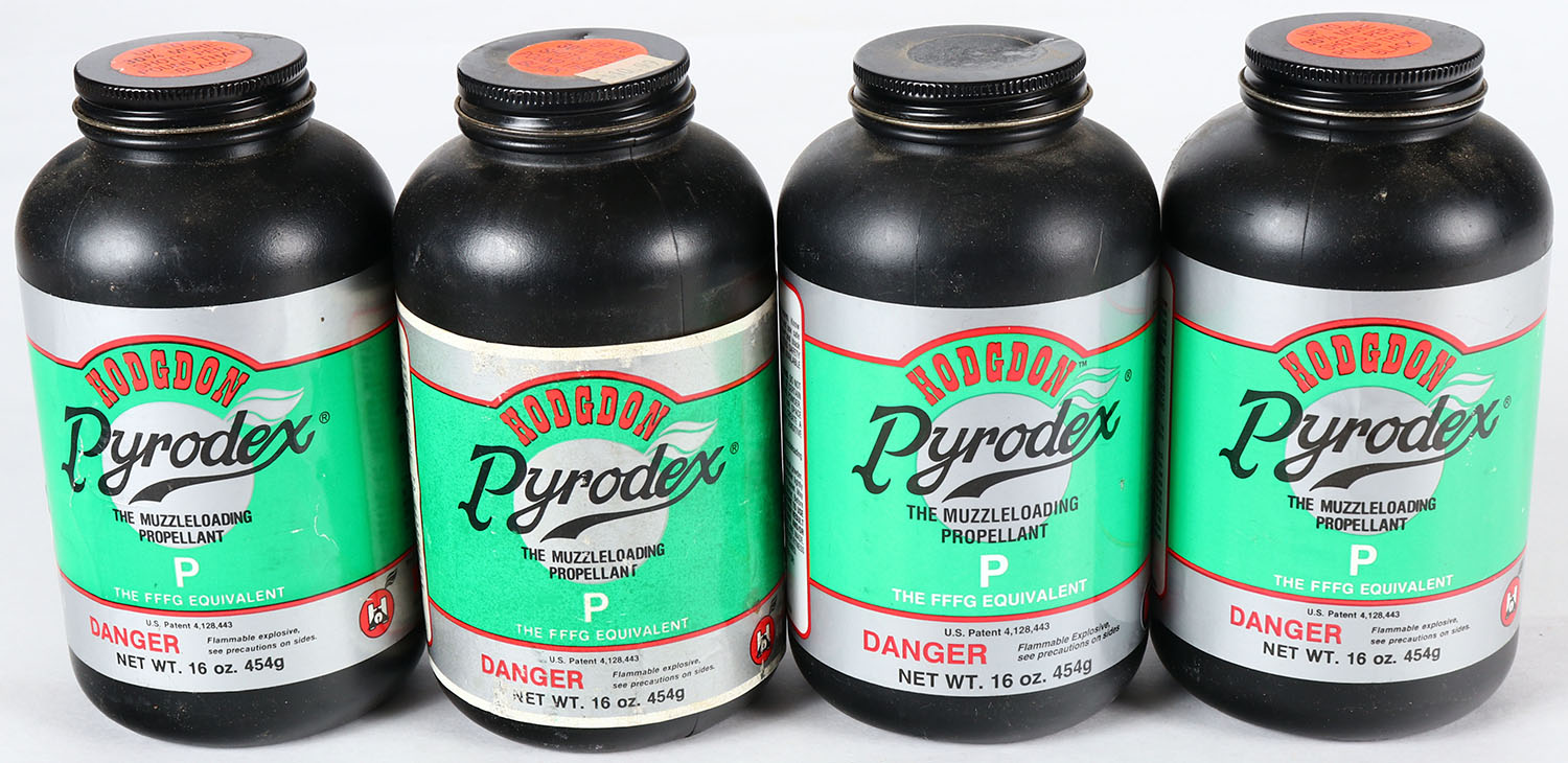 Lot of 4 Hodgdon powder cans, all Partial or nearly full. Grade: Excellent - Value: 10 to 50