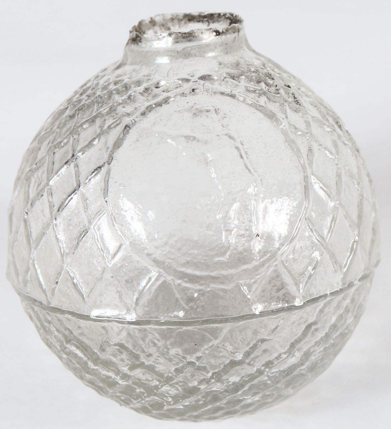 RARE! Clear Glass Target Ball, marked with a trapshooter in around center, fish net design, 3 piece, medium neck, wonderful condition. Grade: Excellent ++ - Value: 600 to 1200