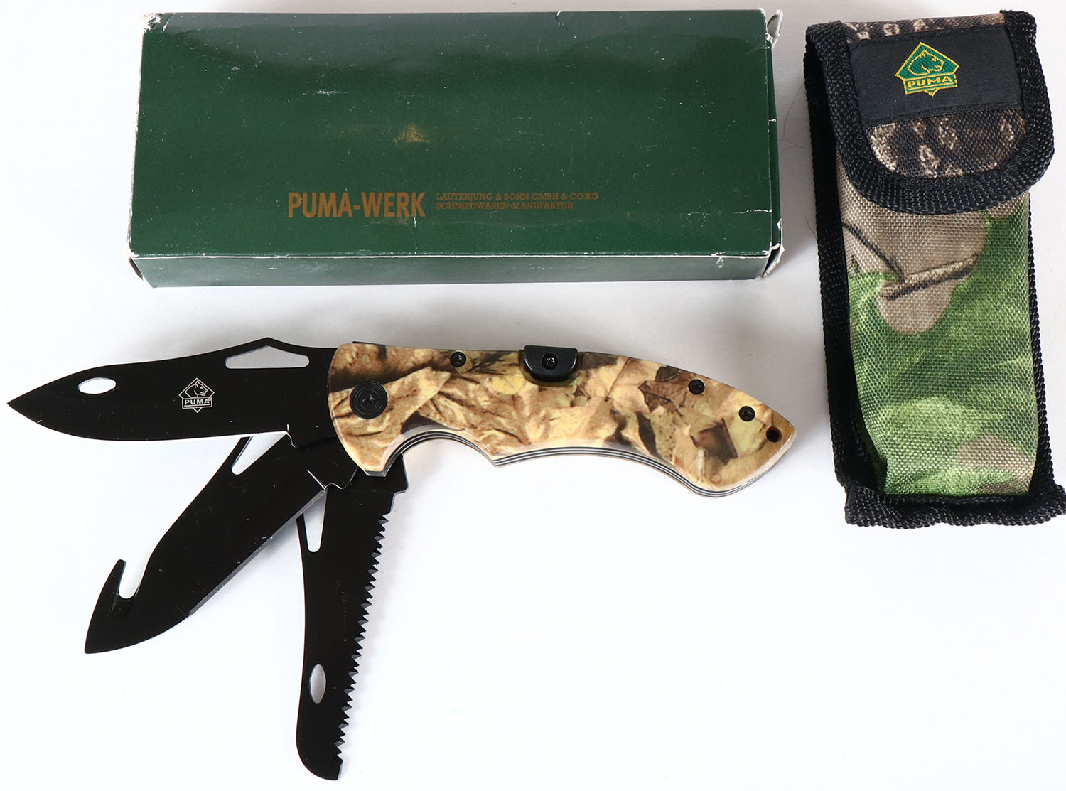 PUMA knife, 3 folding blades, 3 1/2'' blade, camo handle, has sheath and orignal box. Grade: Excellent ++ - Value: 30 to 90