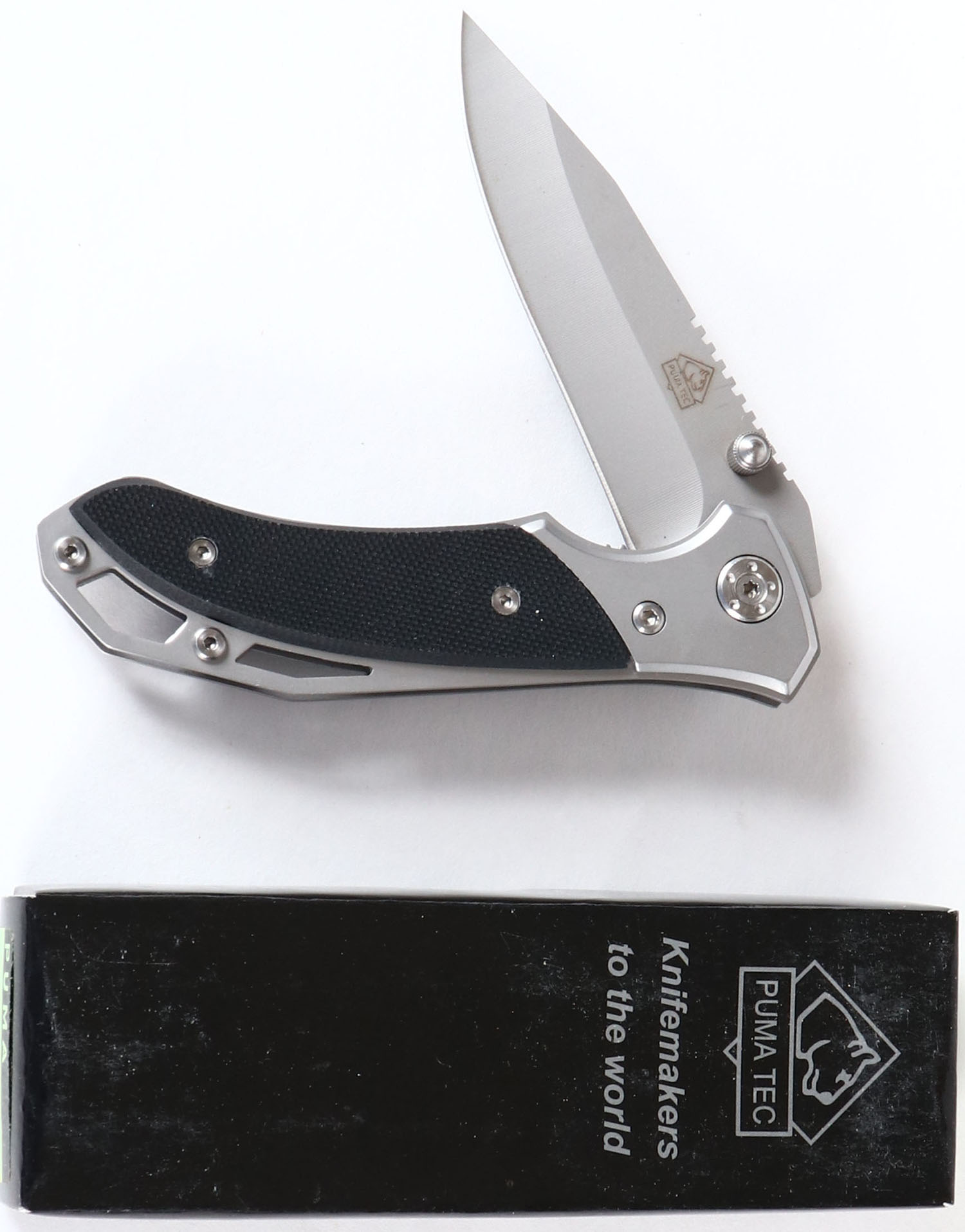 PUMA knife, 1 folding blade, 4'' blade, black handle, has sheath and orignal box. Grade: Excellent ++ - Value: 30 to 90