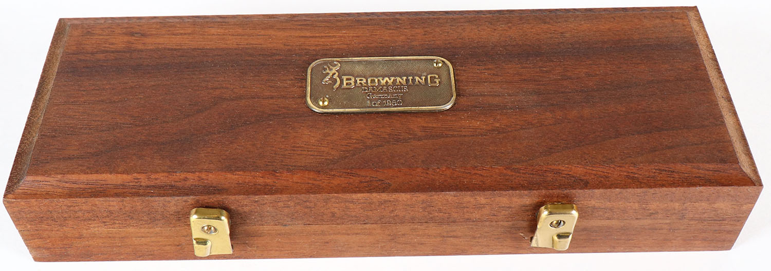 RARE! Browning damascus knife, 3'' blade, intricit design on blade, stag handle, in original box. Grade: Excellent ++ - Value: 50 to 150
