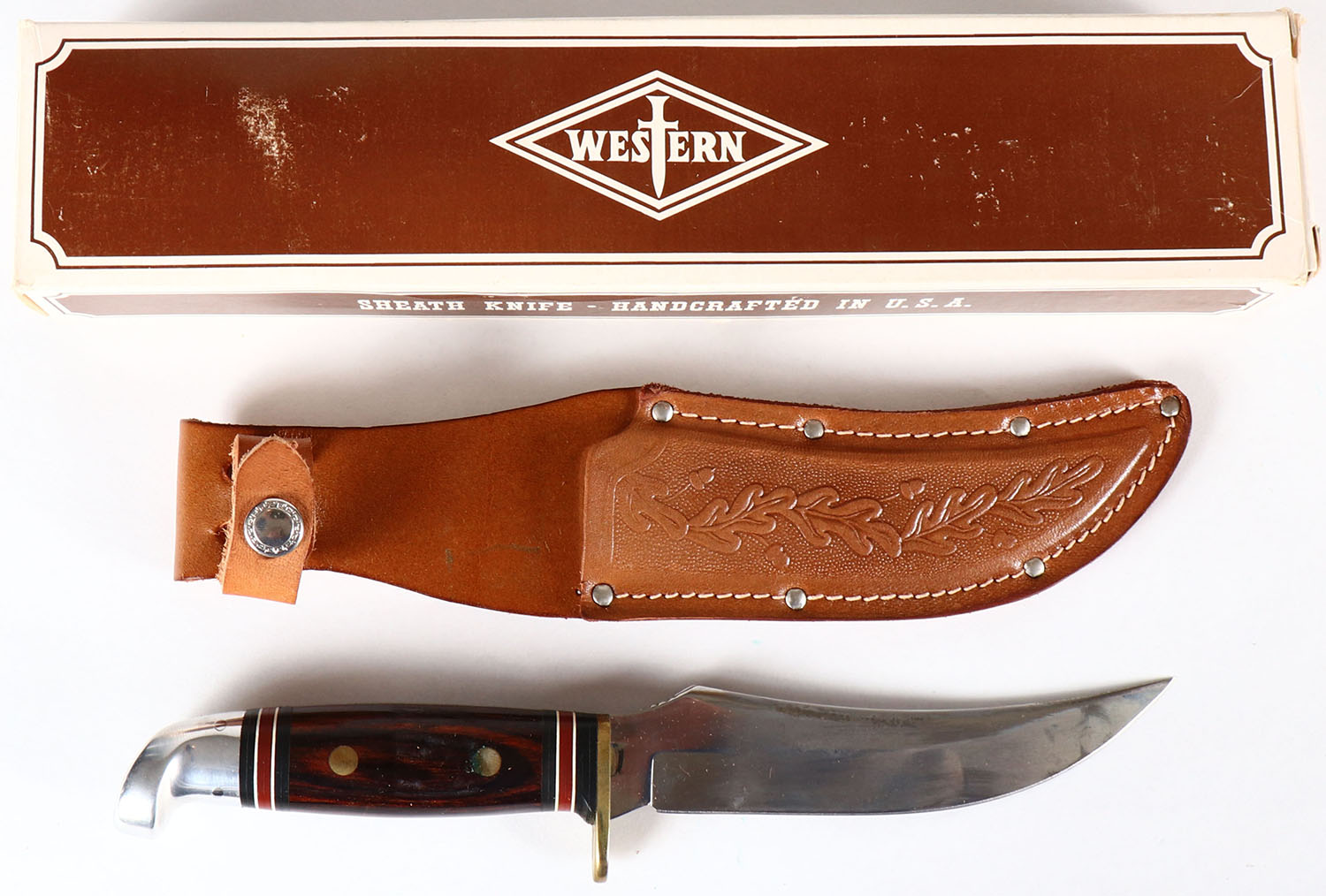 Western fixed blade, 5'' blade, has leather sheath. Grade: Excellent - Value: 16 to 60