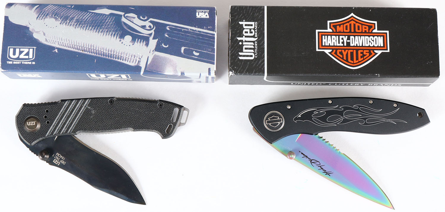 Lot of 2 folding knives, UZI and Harley Davidson, in orignal boxes. Grade: Excellent ++ - Value: 20 to 80
