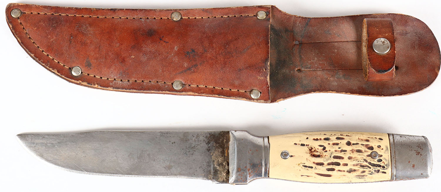Unmarked fixed blade knife, 5'' blade, leather sheath, has age soiling and rust. Grade: Very Good - Value: 4 to 40
