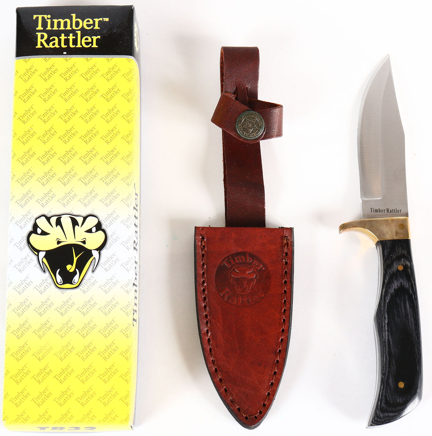 LARGE Timber wolf timber rattler knife, TR32, has leather sheath, in original box. Grade: Excellent ++ - Value: 10 to 50