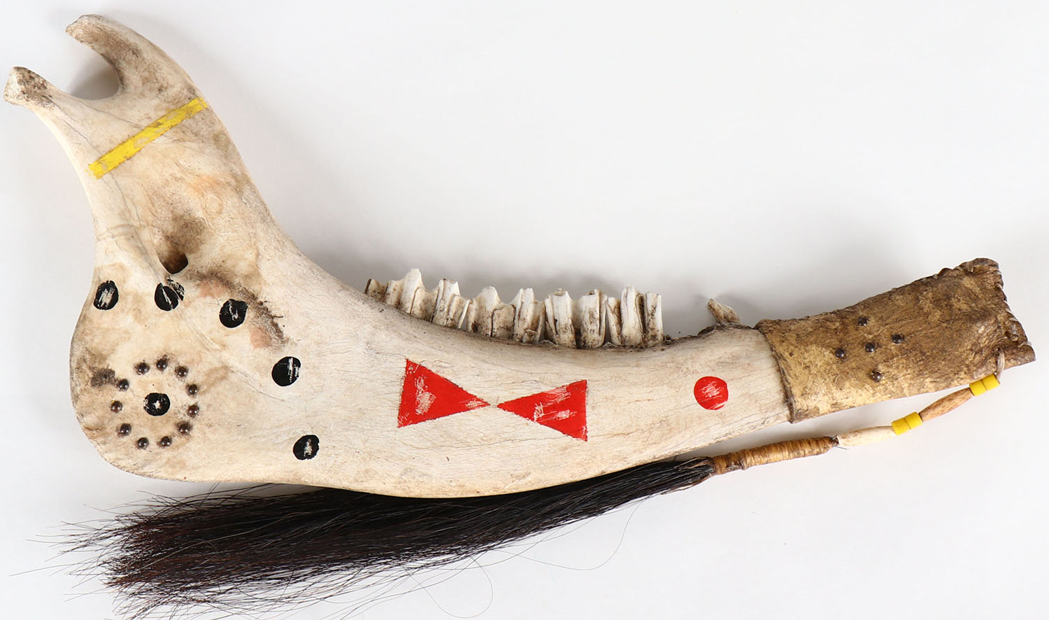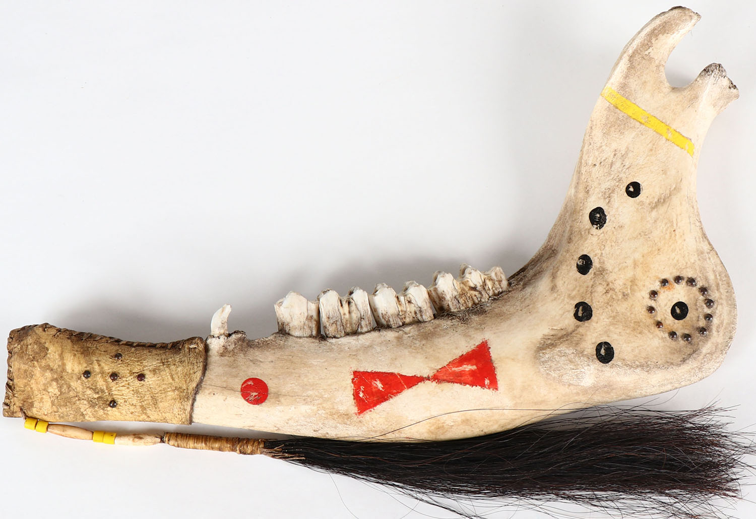 Buffalo Jaw Bone HUGE Plains Indian club brass tacking both sides, rawhide, sinew, horse hair drop, trade beads and paint. Private Collection Arkansas City, Kansas. Circa 1880 - 1890. Grade: Very Good - Value: 100 to 600