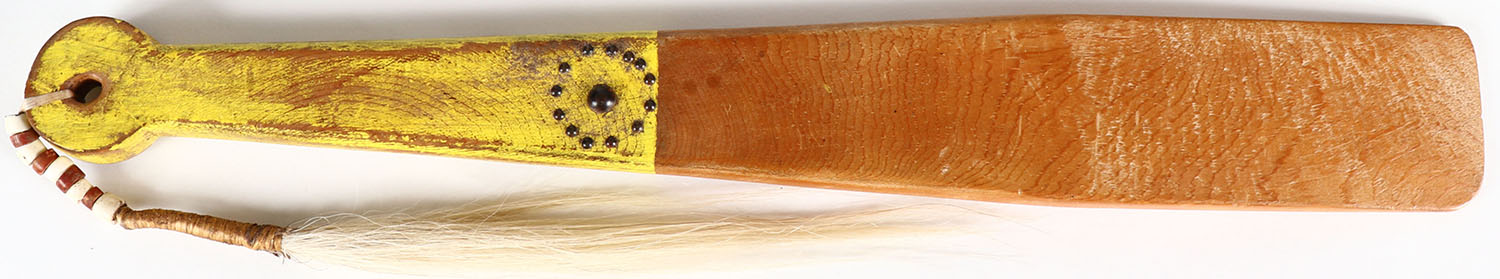 Plains Indian riding quirt circa 1890 trade beads, sinew, brass tacking both sides, white horse hair drop. Grade: Excellent - Value: 20 to 500